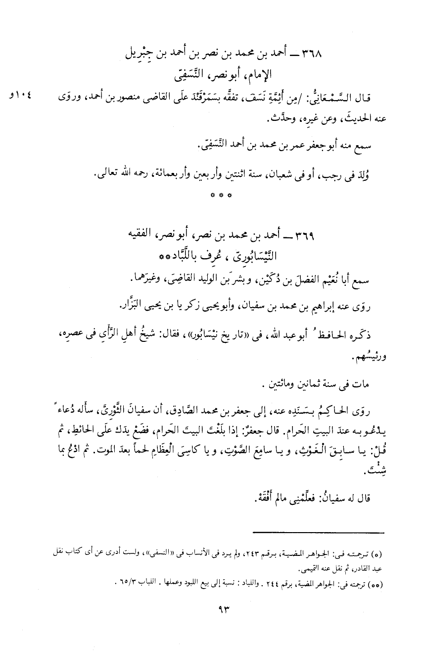 *) ترجمته فى: الجواهر المضية، برقم 243، و لم يرد فى الأنساب فى «النسفى»، و لست أدرى عن أى كتاب نقل عبد القادر، ثم نقل عنه التميمى.