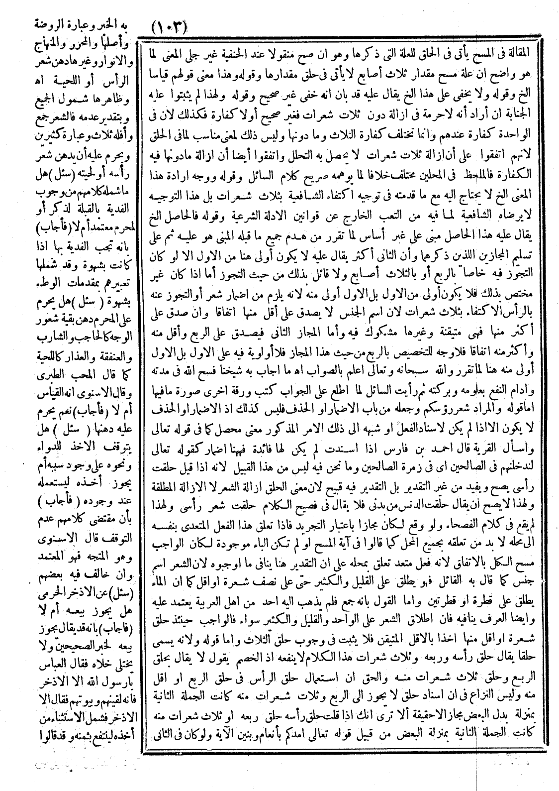 وَاتَّفَقُوا أَيْضًا أَنَّ إزَالَةَ مَا دُونَهَا فِيهِ الْكَفَّارَةُ فَالْمَلْحَظُ فِي الْمَحَلَّيْنِ مُخْتَلِفٌ خِلَافًا لِمَا يُوهِمُهُ صَرِيحُ كَلَامِ السَّائِلِ وَقَوْلُهُ وَوَجْهُ إرَادَةِ هَذَا الْمَعْنَى إلَخْ لَا يُحْتَاجُ إلَيْهِ مَعَ مَا قَدَّمْته فِي تَوْجِيهِ اكْتِفَاءِ الشَّافِعِيَّةِ بِثَلَاثِ شَعَرَاتٍ بَلْ هَذَا التَّوْجِيهُ لَا يَرْضَاهُ الشَّافِعِيَّةُ لِمَا فِيهِ مِنْ التَّعَسُّفِ الْخَارِجِ عَنْ قَوَانِينِ الْأَدِلَّةِ الشَّرْعِيَّةِ وَقَوْلُهُ فَالْحَاصِلُ إلَخْ يُقَالُ عَلَيْهِ هَذَا الْحَاصِلُ مَبْنِيٌّ عَلَى غَيْرِ أَسَاسٍ لِمَا تَقَرَّرَ مِنْ هَدْمِ جَمِيعِ مَا قَبْلَهُ الْمَبْنِيِّ هُوَ عَلَيْهِ ثُمَّ عَلَى تَسْلِيمِ الْمَجَازَيْنِ اللَّذَيْنِ ذَكَرَهُمَا وَأَنَّ الثَّانِيَ أَكْثَرُ يُقَالُ عَلَيْهِ لَا يَكُونُ أَوْلَى هُنَا مِنْ الْأَوَّلِ إلَّا لَوْ كَانَ التَّجَوُّزُ فِيهِ خَاصًّا بِالرُّبْعِ أَوْ بِالثَّلَاثِ أَصَابِعَ وَلَا قَائِلَ بِذَلِكَ مِنْ حَيْثُ التَّجَوُّزِ أَمَّا إذَا كَانَ غَيْرَ مُخْتَصٍّ بِذَلِكَ فَلَا يَكُونُ أَوْلَى مِنْ الْأَوَّلِ بَلْ الْأَوَّلُ أَوْلَى مِنْهُ لِأَنَّهُ يَلْزَمُ مِنْ إضْمَارِ شَعْرٍ أَوْ التَّجَوُّزِ عَنْهُ بِالرَّأْسِ الِاكْتِفَاءُ بِثَلَاثِ شَعَرَاتٍ لِأَنَّ اسْمَ الْجِنْسِ لَا يَصْدُقُ عَلَى أَقَلَّ مِنْهَا اتِّفَاقًا وَإِنْ صَدَقَ عَلَى أَكْثَرَ مِنْهَا فَهِيَ مُتَيَقَّنَةٌ وَغَيْرُهَا مَشْكُوكٌ فِيهِ.