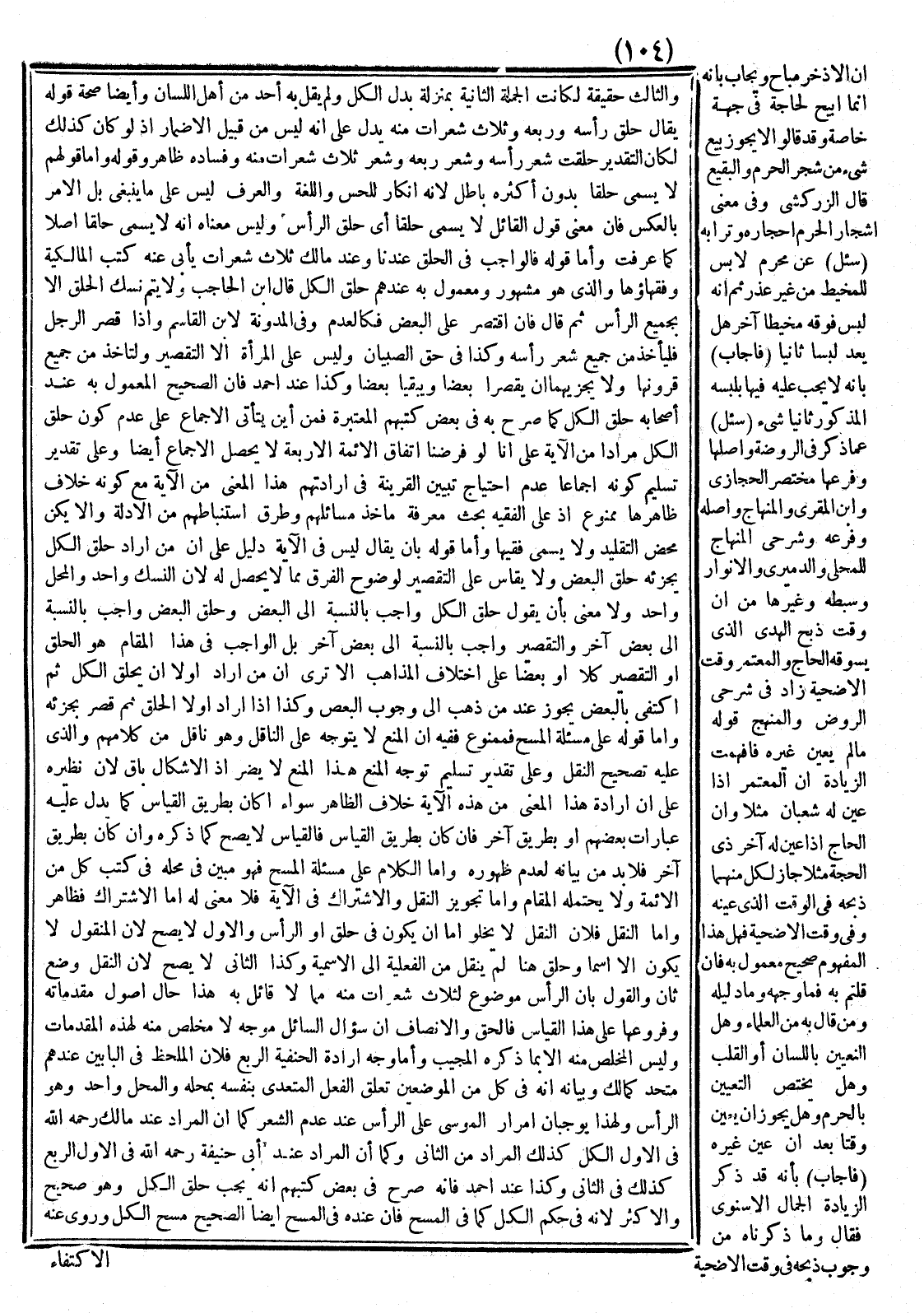 وَأَمَّا الْكَلَامُ عَلَى مَسْأَلَةِ الْمَسْحِ فَهُوَ مُبَيَّنٌ فِي مَحَلِّهِ فِي كُتُبِ كُلٌّ مِنْ الْأَئِمَّةِ وَلَا يَحْتَمِلهُ الْمَقَامُ وَأَمَّا تَجْوِيزُ النَّقْلِ وَالِاشْتِرَاكُ فِي الْآيَةِ فَلَا مَعْنَى لَهُ أَمَّا الِاشْتِرَاكُ فَظَاهِرٌ وَأَمَّا النَّقْلُ فَلِأَنَّ النَّقْلَ لَا يَخْلُو إمَّا أَنْ يَكُونَ فِي حَلْقٍ أَوْ الرَّأْسِ وَالْأَوَّلُ لَا يَصِحُّ لِأَنَّ الْمَنْقُولَ لَا يَكُونُ إلَّا اسْمًا وَحَلَقَ هُنَا لَمْ يُنْقَلْ مِنْ الْفِعْلِيَّةِ إلَى الِاسْمِيَّةِ وَكَذَا الثَّانِي لَا يَصِحُّ لِأَنَّ النَّقْلَ وَضْعٌ ثَانٍ وَالْقَوْلُ بِأَنَّ الرَّأْسَ مَوْضُوعٌ لِثَلَاثِ شَعَرَاتٍ مِنْهُ مِمَّا لَا قَائِلَ بِهِ هَذَا حَالُ أُصُولِ مُقَدِّمَاتِهِ وَفُرُوعُهَا عَلَى هَذَا الْقِيَاسِ فَالْحَقُّ وَالْإِنْصَافُ أَنَّ سُؤَالَ السَّائِلِ مُوَجَّهٌ لَا مُخَلِّصَ مِنْهُ لِهَذِهِ الْمُقَدَّمَاتِ وَلَيْسَ الْمُخَلِّصُ مِنْهُ إلَّا بِمَا ذَكَرَهُ الْمُجِيبُ وَأَمَّا وَجْهُ إرَادَةِ الْحَنَفِيَّةِ الرُّبْعَ فَلِأَنَّ الْمَلْحَظَ فِي الْبَابَيْنِ عِنْدَهُمْ مُتَّحِدٌ كَمَالِكٍ.