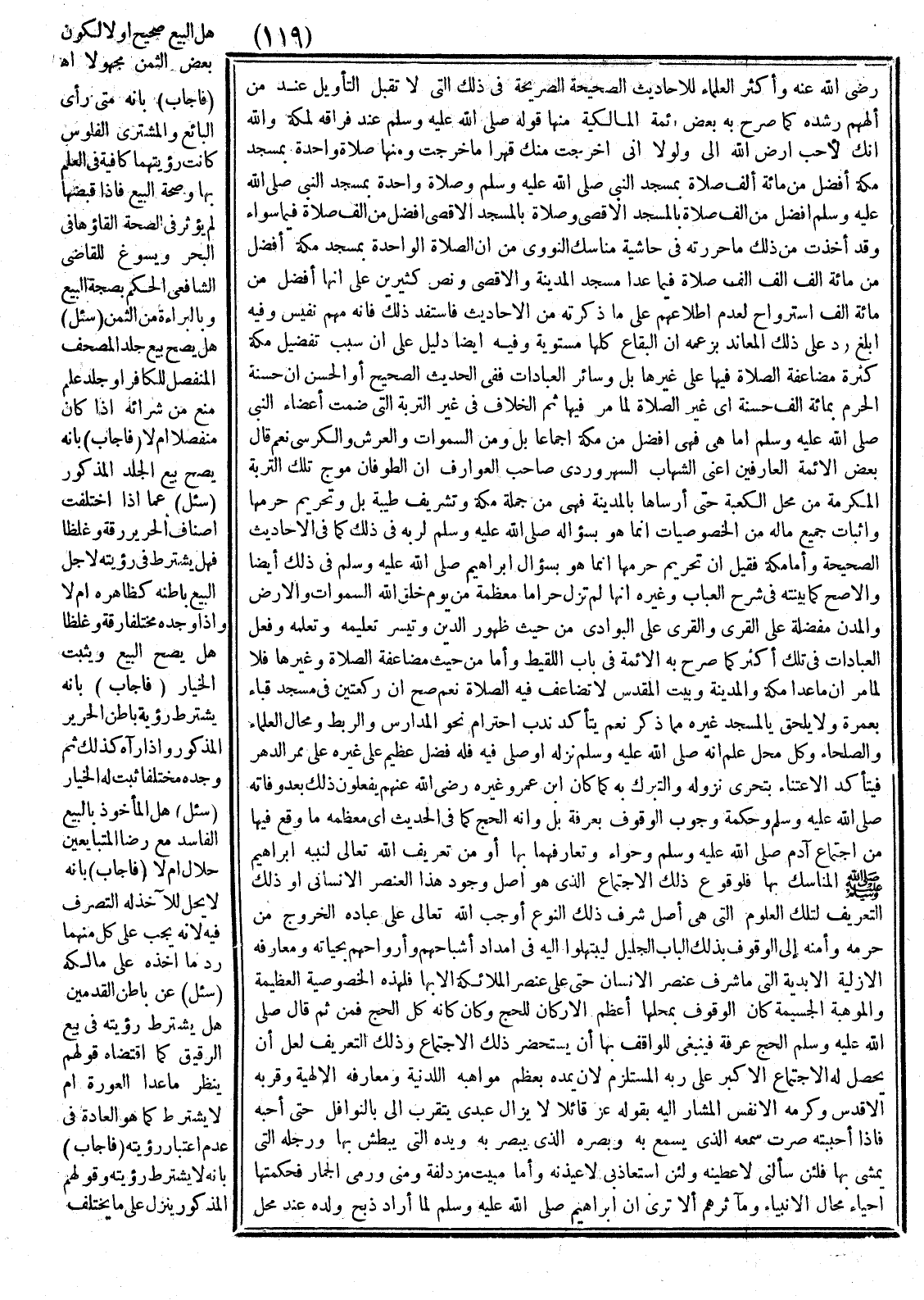 وَمِنْهَا «صَلَاةٌ وَاحِدَةٌ بِمَسْجِدِ مَكَّةَ أَفْضَلُ مِنْ مِائَةِ أَلْفِ صَلَاةٍ بِمَسْجِدِ النَّبِيِّ - صَلَّى اللَّهُ عَلَيْهِ وَسَلَّمَ - وَصَلَاةٌ وَاحِدَةٌ بِمَسْجِدِ النَّبِيِّ - صَلَّى اللَّهُ عَلَيْهِ وَسَلَّمَ - أَفْضَلُ مِنْ أَلْفِ صَلَاةٍ بِالْمَسْجِدِ الْأَقْصَى وَصَلَاةٌ بِالْمَسْجِدِ الْأَقْصَى أَفْضَلُ مِنْ أَلْفِ صَلَاةٍ فِيمَا سِوَاهُ» وَقَدْ أَخَذْت مِنْ ذَلِكَ مَا حَرَّرْته فِي حَاشِيَةِ مَنَاسِكِ النَّوَوِيِّ مِنْ أَنَّ الصَّلَاةَ الْوَاحِدَةَ بِمَسْجِدِ مَكَّةَ أَفْضَلُ مِنْ مِائَةِ أَلْفِ أَلْفِ أَلْفِ صَلَاةٍ فِيمَا عَدَا مَسْجِدِ الْمَدِينَةِ وَالْأَقْصَى وَنَصُّ كَثِيرِينَ عَلَى أَنَّهَا أَفْضَلُ مِنْ مِائَةِ أَلْفِ اسْتِرْوَاحٍ لِعَدَمِ اطِّلَاعِهِمْ عَلَى مَا ذَكَرْته مِنْ الْأَحَادِيثِ فَاسْتَفِدْ ذَلِكَ فَإِنَّهُ مُهِمٌّ نَفِيسٌ وَفِيهِ أَبْلَغُ رَدٍّ عَلَى ذَلِكَ الْمُعَانِدِ بِزَعْمِهِ أَنَّ الْبِقَاعَ كُلَّهَا مُسْتَوِيَةٌ وَفِيهِ أَيْضًا دَلِيلٌ عَلَى أَنَّ سَبَبَ تَفْضِيلِ مَكَّةَ كَثْرَةُ مُضَاعَفَةِ الصَّلَاةِ فِيهَا عَلَى غَيْرِهَا بَلْ سَائِرِ الْعِبَادَاتِ فَفِي الْحَدِيثِ الصَّحِيحِ أَوْ الْحَسَنِ أَنَّ «حَسَنَةَ الْحَرَمِ بِمِائَةِ أَلْفِ حَسَنَةٍ» أَيْ غَيْرِ الصَّلَاةِ لِمَا مَرَّ فِيهَا.
