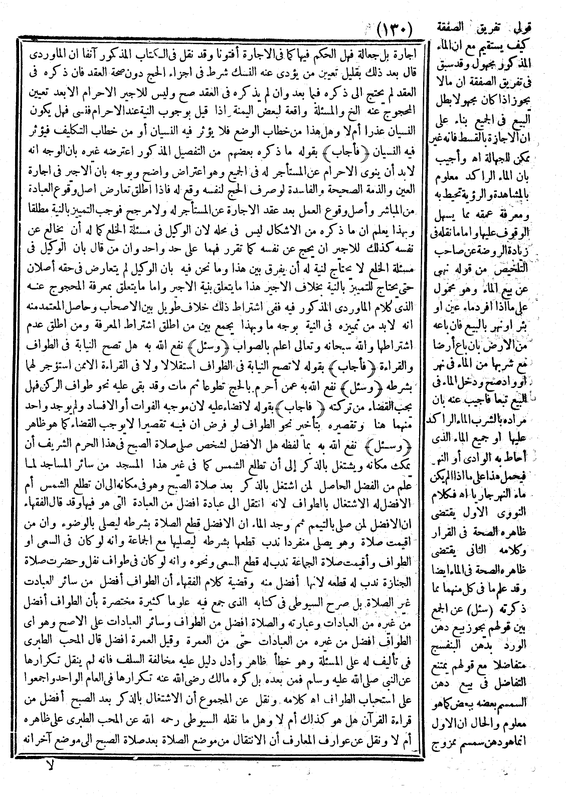 وَقَضِيَّةُ كَلَامِ الْفُقَهَاءِ أَنَّ الطَّوَافَ أَفْضَلُ مِنْ سَائِرِ الْعِبَادَاتِ غَيْرِ الصَّلَاةِ بَلْ صَرَّحَ السُّيُوطِيّ فِي كِتَابِهِ الَّذِي جَمَعَ فِيهِ عُلُومًا كَثِيرَةً مُخْتَصَرَةً بِأَنَّ الطَّوَافَ أَفْضَلُ مِنْ غَيْرِهِ مِنْ الْعِبَادَاتِ وَعِبَارَتُهُ وَالصَّلَاةُ أَفْضَلُ مِنْ الطَّوَافِ وَسَائِرِ الْعِبَادَاتِ عَلَى الْأَصَحِّ وَهُوَ أَيْ الطَّوَافُ أَفْضَلُ مِنْ غَيْرِهِ مِنْ الْعِبَادَاتِ حَتَّى مِنْ الْعُمْرَةِ وَقِيلَ الْعُمْرَةُ أَفْضَلُ قَالَ الْمُحِبُّ الطَّبَرِيُّ فِي تَأْلِيفٍ لَهُ عَلَى الْمَسْأَلَةِ وَهُوَ خَطَأٌ ظَاهِرٌ وَأَدَلُّ دَلِيلٍ عَلَيْهِ مُخَالِفَةُ السَّلَفِ فَإِنَّهُ لَمْ يُنْقَلْ تَكْرَارُهَا عَنْ النَّبِيِّ - صَلَّى اللَّهُ عَلَيْهِ وَسَلَّمَ - فَمَنْ بَعْدَهُ بَلْ كَرِهَ مَالِكٌ - رَضِيَ اللَّهُ عَنْهُ - تَكْرَارَهَا فِي الْعَامِ الْوَاحِدِ وَأَجْمَعُوا عَلَى اسْتِحْبَابِ الطَّوَافِ اهـ كَلَامُهُ وَنُقِلَ عَنْ الْمَجْمُوعِ أَنَّ الِاشْتِغَالَ بِالذِّكْرِ بَعْدَ الصُّبْحِ أَفْضَلُ مِنْ قِرَاءَةِ الْقُرْآنِ هَلْ هُوَ كَذَلِكَ أَمْ لَا وَهَلْ مَا نَقَلَهُ السُّيُوطِيّ - رَحِمَهُ اللَّهُ - عَنْ الْمُحِبِّ الطَّبَرِيِّ عَلَى ظَاهِرِهِ أَمْ لَا.