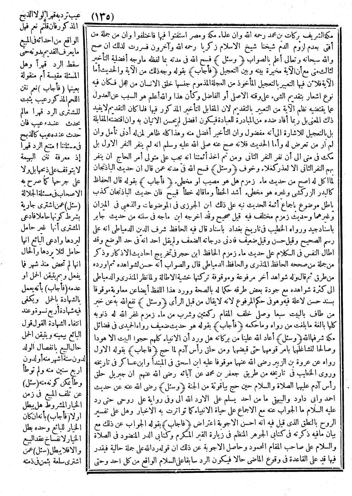(فَأَجَابَ) بِقَوْلِهِ الْجَوَابُ عَنْ ذَلِكَ مَعَ بَيَانِ مَا فِيهِ ذَكَرْته فِي كِتَابِي الْجَوْهَرُ الْمُنَظَّمُ فِي زِيَارَةِ الْقَبْرِ الْمُكَرَّمِ وَكِتَابِي الدُّرُّ الْمَنْضُودُ فِي الصَّلَاةِ وَالسَّلَامِ عَلَى صَاحِبِ الْمَقَامِ الْمَحْمُودِ وَحَاصِلُ الْأَجْوِبَةِ عَنْ ذَلِكَ أَنَّ قَوْلَهُ رَدَّ اللَّهُ عَلَيَّ جُمْلَةٌ حَالِيَّةٌ فَيُقَدَّرُ فِيهَا قَدْ عَلَى الْقَاعِدَةِ فِي وُقُوعِ الْمَاضِي حَالًا فَيَكُونُ الرَّدُّ سَابِقًا عَلَى السَّلَامِ الْوَاقِعِ مِنْ كُلِّ أَحَدٍ وَحَتَّى