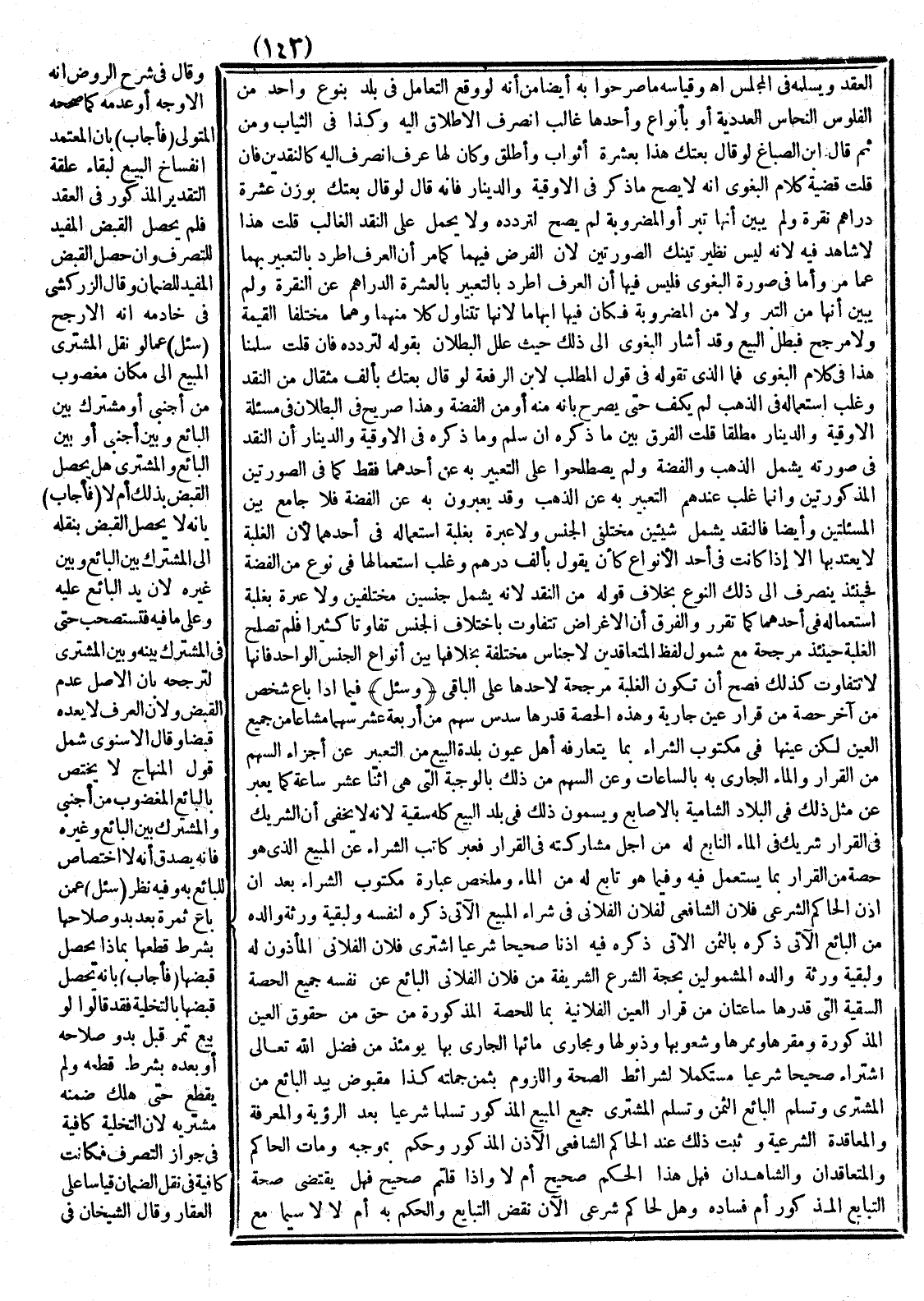 الْعَقْدِ وَيُسَلِّمُهُ فِي الْمَجْلِسِ اهـ وَقِيَاسُهُ مَا صَرَّحُوا بِهِ أَيْضًا مِنْ أَنَّهُ لَوْ وَقَعَ التَّعَامُلُ فِي بَلَدٍ بِنَوْعٍ وَاحِدٍ مِنْ الْفُلُوسِ النُّحَاسِ الْعَدَدِيَّةِ أَوْ بِأَنْوَاعٍ وَأَحَدُهَا غَالِبٌ انْصَرَفَ الْإِطْلَاقُ إلَيْهِ وَكَذَا فِي الثِّيَابِ وَمِنْ ثَمَّ قَالَ ابْنُ الصَّبَّاغِ لَوْ قَالَ بِعْتُك هَذَا بِعَشْرَةِ أَثْوَابٍ وَأَطْلَقَ وَكَانَ لَهَا عُرْفٌ انْصَرَفَ إلَيْهِ كَالنَّقْدَيْنِ فَإِنْ قُلْتَ قَضِيَّةُ كَلَامِ الْبَغَوِيِّ أَنَّهُ لَا يَصِحُّ مَا ذُكِرَ فِي الْأُوقِيَّةِ وَالدِّينَارِ فَإِنَّهُ قَالَ لَوْ قَالَ بِعْتُك بِوَزْنِ عَشْرَةِ دَرَاهِمَ نَقْرَة وَلَمْ يُبَيِّنْ أَنَّهَا تِبْرٌ أَوْ الْمَضْرُوبَةُ لَمْ يَصِحَّ لِتَرَدُّدِهِ وَلَا يَحْمِلُ عَلَى النَّقْدِ الْغَالِبِ قُلْتُ هَذَا لَا شَاهِدَ فِيهِ لِأَنَّهُ لَيْسَ نَظِيرَ تَيْنِكَ الصُّورَتَيْنِ لِأَنَّ الْفَرْضَ فِيهِمَا كَمَا مَرَّ أَنَّ الْعُرْفَ اطَّرَدَ بِالتَّعْبِيرِ بِهِمَا عَمَّا مَرَّ.