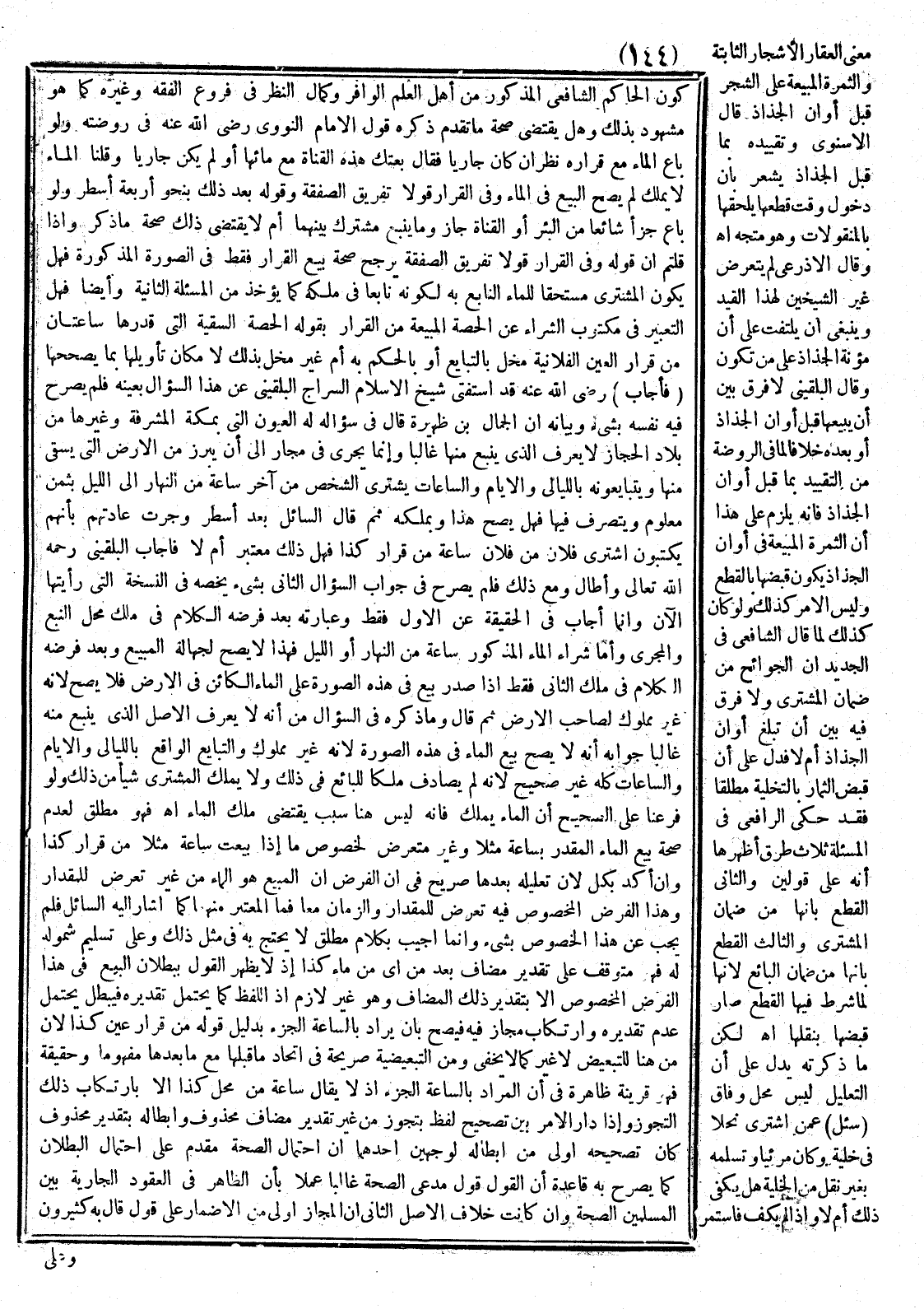 كَوْنِ الْحَاكِمِ الشَّافِعِيِّ الْمَذْكُورِ مِنْ أَهْلِ الْعِلْمِ الْوَافِرِ وَكَمَالِ النَّظَرِ فِي فُرُوعِ الْفِقْهِ وَغَيْرِهِ كَمَا هُوَ مَشْهُودٌ بِذَلِكَ وَهَلْ يَقْتَضِي صِحَّةُ مَا تَقَدَّمَ ذِكْرُهُ قَوْلُ الْإِمَامِ النَّوَوِيِّ - رَضِيَ اللَّهُ عَنْهُ - فِي رَوْضَتِهِ وَلَوْ بَاعَ الْمَاءَ مَعَ قَرَارِهِ نُظِرَ إنْ كَانَ جَارِيًا فَقَالَ بِعْتُك هَذِهِ الْقَنَاةَ مَعَ مَائِهَا أَوْ لَمْ يَكُنْ جَارِيًا وَقُلْنَا الْمَاءُ لَا يُمَلَّكُ لَمْ يَصِحَّ الْبَيْعُ فِي الْمَاءِ وَفِي الْقَرَارِ قَوْلًا تَفْرِيق الصَّفْقَةِ.