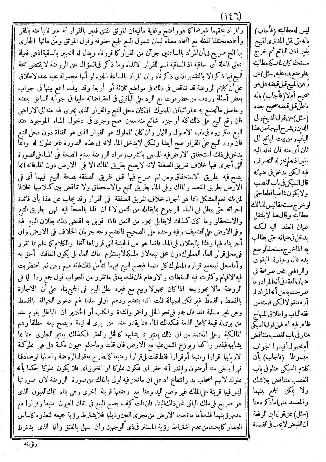 وَغَايَةُ مَا فِيهِ أَنَّ الْمُوَثَّقَ تَفَنَّنَ فَعَبَّرَ بِالْقَرَارِ ثُمَّ عَبَّرَ ثَانِيًا عَنْهُ بِالْمُقِرِّ وَأَعَادَهُ مُخْتَلِفًا لَفْظُهُ مَعَ اتِّحَادِ مَعْنَاهُ لِبَيَانِ شُمُولِ الْبَيْعِ لِجَمِيعِ حُقُوقِهِ وَقَوْلِ الْمُوَثَّقِ وَمِنْ مَائِهَا الْجَارِي بِهَا إلَخْ صَرِيحٌ فِي أَنَّ الْمُرَادَ بِالسَّاعَتَيْنِ جُزْءَانِ مِنْ الْقَرَارِ كَمَا قَرَّرْنَاهُ وَيَدُلُّ لَهُ التَّعْبِيرُ بِالسَّقِيَّةِ إذْ هِيَ فَعِيلَةٌ بِمَعْنَى فَاعِلَةٍ أَيْ سَاقِيَّةٌ إذْ السَّاقِيَّةُ اسْمٌ لِلْقَرَارِ لَا لِلْمَاءِ وَمَا ذُكِرَ فِي السُّؤَالِ عَنْ الرَّوْضَةِ لَا يَقْتَضِي صِحَّةَ الْبَيْعِ فِيمَا ذُكِرَ إلَّا بِالتَّقْدِيرِ الَّذِي ذَكَرْنَاهُ وَأَنَّ الْمُرَادَ بِالسَّاعَةِ الْجُزْءُ أَوْ أَنَّهَا مَحْمُولَةٌ عَلَيْهِ عِنْدَ الْإِطْلَاقِ عَلَى أَنَّ كَلَامَ الرَّوْضَةِ قَدْ تَنَاقَضَ فِي ذَلِكَ فِي مَوَاضِعَ ثَلَاثَةٍ أَوْ أَرْبَعَةٍ وَقَدْ بَيَّنْتُ الْجَمْعَ بَيْنَهُمَا فِي جَوَابِ بَعْضِ أَسْئِلَةٍ وَرَدَتْ مِنْ حَضْرَمَوْتَ مَعَ الرَّدِّ عَلَى الْبُلْقِينِيُّ فِي اعْتِرَاضَاتِهِ عَلَيْهَا فِي جَوَابِهِ السَّابِقِ بَعْضُهُ وَحَاصِلُ مَا تَجْتَمِعُ بِهِ عِبَارَتُهَا أَنَّ الْمَمْلُوكَ إنْ كَانَ مَحَلُّ النَّبْعِ وَالْقَرَارِ الَّذِي يَجْرِي فِيهِ مِنْهُ إلَى الْأَرَاضِي فَإِنْ وَقَعَ الْبَيْعُ عَلَى ذَلِكَ كُلِّهِ أَوْ جُزْءٍ شَائِعٍ مِنْهُ مُعَيَّنٍ صَحَّ وَجَرَى فِي دُخُولِ الْمَاءِ الْمَوْجُودِ عِنْدَ الْبَيْعِ مَا قَرَّرُوهُ فِي بَابِ الْأُصُولِ وَالثِّمَارِ.