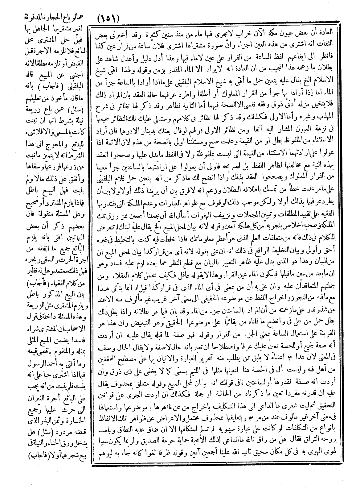 وَقَوْلُهُ فَهُوَ صِفَةٌ لِمَا قَبْلَهُ يُقَالُ عَلَيْهِ إنْ أَرَدْتَ أَنَّهُ صِفَةٌ لِجَمِيعٍ أَوْ لِلْحِصَّةِ تَعَيَّنَ عَلَيْك عُرْفًا وَاصْطِلَاحًا أَنْ تُعَبِّرَ بِأَنَّهُ حَالٌ لَا صِفَةٌ وَلَا يُقَالُ الْحَالُ وَصْفٌ فِي الْمَعْنَى لِأَنَّ هَذَا اعْتِنَاءٌ لَا يَلِيقُ مِمَّنْ يُطْلَبُ مِنْهُ تَحْرِيرُ الْعِبَارَةِ وَالْإِتْيَانُ بِهَا عَلَى مُصْطَلَحِ الْمُحَقِّقِينَ مِنْ أَهْلِ فَنِّهِ وَلَيْسَتْ أَلْ فِي الْحِصَّةِ هُنَا لِتُعَيِّنَهَا مِثْلُهَا فِي اللَّئِيمِ يَسُبُّنِي كَمَا لَا يَخْفَى عَلَى ذِي ذَوْقٍ وَإِنْ أَرَدْتَ أَنَّهُ صِفَةٌ لِقَدْرِهَا أَوْ لِسَاعَتَيْنِ نَافَى قَوْلَكَ أَنَّهُ بَيَانٌ لِمَحَلِّ الْمَبِيعِ وَقَوْلُهُ مُتَعَلِّقٌ بِمَحْذُوفٍ يُقَالُ عَلَيْهِ إنْ قَدَّرْتَهُ مُفْرَدًا تَعَيَّنَ مَا ذَكَرْنَاهُ مِنْ الْحَالِيَّةِ أَوْ جُمْلَةٍ. فَكَذَلِكَ إنْ أَرَدْتَ الْجَرْيَ عَلَى قَوَانِينِ التَّحْقِيقِ ثُمَّ لَيْتَ شِعْرِي مَا الدَّاعِي إلَى هَذَا التَّكَلُّفِ بِإِخْرَاجِ مِنْ عَنْ ظَاهِرِهَا وَمَوْضُوعِهَا وَاسْتِعْمَالِهَا فِي مَعْنًى آخَرَ غَيْرِ مَأْلُوفٍ عِنْدَ مَنْ مَرّ وَبِتَعْلِيقِهَا بِمَحْذُوفٍ مُحْتَمَلٍ وَالْإِعْرَاضُ عَنْ ظَوَاهِرِ تِلْكَ الْأَلْفَاظِ بِأَنْوَاعٍ مِنْ التَّكْلِيفِ لَوْ كَانَتْ عَلَى عِبَارَةِ سِيبَوَيْهِ لَمْ تَسْلَمْ لِمُتَكَلِّفِهَا إلَّا إنْ ضَاقَ عَلَيْهِ النِّطَاقُ وَبَلَغَتْ رُوحُهُ التَّرَاقِيَ فَقَالَ هَلْ مِنْ رَاقٍ تَاللَّهِ مَا الدَّاعِي لِذَلِكَ إلَّا مَحَبَّةُ حِمَايَةِ حُرْمَةِ هَذَا الصَّدِيقِ وَلَرُبَّمَا يَكُونُ سَبَبًا لِهَوَى الْهُوِيِّ بِهِ فِي كُلِّ مَكَان سَحِيقٍ تَابَ اللَّهُ عَلَيْنَا أَجْمَعِينَ آمِينَ.