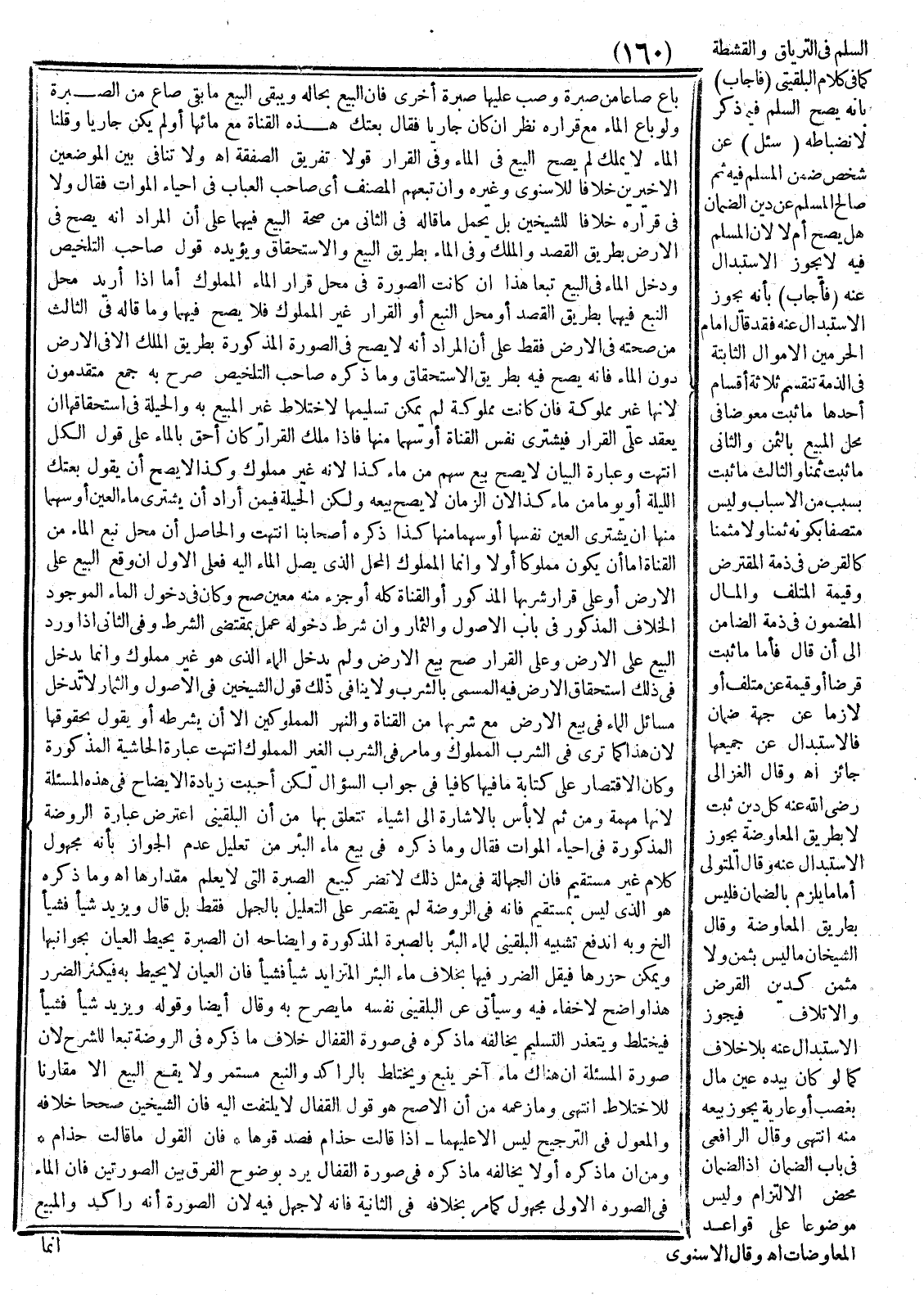 وَالْحَاصِلُ أَنَّ مَحَلَّ نَبْعِ الْمَاءِ مِنْ الْقَنَاةِ إمَّا أَنْ يَكُونَ مَمْلُوكًا أَوْ لَا وَإِنَّمَا الْمَمْلُوكُ الْمَحَلُّ الَّذِي يَصِلُ الْمَاءُ إلَيْهِ فَعَلَى الْأَوَّلِ إنْ وَقَعَ الْبَيْعُ عَلَى الْأَرْضِ أَوْ عَلَى قَرَارِ شُرْبِهَا الْمَذْكُورِ أَوْ الْقَنَاةِ كُلِّهِ أَوْ جُزْءٍ مِنْهُ مُعَيَّنٍ صَحَّ وَكَانَ فِي دُخُولِ الْمَاءِ الْمَوْجُودِ الْخِلَافُ الْمَذْكُورُ فِي بَابِ الْأُصُولِ وَالثِّمَارِ وَإِنْ شَرَطَ دُخُولَهُ عَمِلَ بِمُقْتَضَى الشَّرْطِ وَفِي الثَّانِي إذَا وَرَدَ الْبَيْعُ عَلَى الْأَرْضِ وَعَلَى الْقَرَارِ صَحَّ بَيْعُ الْأَرْضِ وَلَمْ يَدْخُلْ الْمَاءُ الَّذِي هُوَ غَيْرُ مَمْلُوكٍ وَإِنَّمَا يَدْخُلُ فِي ذَلِكَ اسْتِحْقَاقُ الْأَرْضِ فِيهِ الْمُسَمَّى بِالشُّرْبِ وَلَا يُنَافِي ذَلِكَ قَوْلَ الشَّيْخَيْنِ فِي الْأُصُولِ وَالثِّمَارِ وَلَا تَدْخُلُ مَسَائِلُ الْمَاءِ فِي بَيْعِ الْأَرْضِ مَعَ شُرْبهَا مِنْ الْقَنَاةِ وَالنَّهْرِ الْمَمْلُوكَيْنِ إلَّا أَنْ يَشْرِطَهُ أَوْ يَقُولَ بِحُقُوقِهَا لِأَنَّ هَذَا كَمَا تَرَى فِي الشُّرْبِ الْمَمْلُوكِ وَمَا مَرَّ فِي الشُّرْبِ الْغَيْرِ الْمَمْلُوكِ انْتَهَتْ عِبَارَةُ الْحَاشِيَةِ الْمَذْكُورَةِ وَكَانَ الِاقْتِصَارُ عَلَى كِتَابَةِ مَا فِيهَا كَافِيًا فِي جَوَابِ السُّؤَالِ لَكِنْ أَحْبَبْت زِيَادَةَ الْإِيضَاحِ فِي هَذِهِ الْمَسْأَلَةِ لِأَنَّهَا مُهِمَّةٌ وَمِنْ ثَمَّ لَا بَأْسَ بِالْإِشَارَةِ إلَى أَشْيَاءَ تَتَعَلَّقُ بِهَا مِنْهَا أَنَّ الْبُلْقِينِيُّ اعْتَرَضَ عِبَارَةَ الرَّوْضَةِ الْمَذْكُورَةَ فِي إحْيَاءِ الْمَوَاتِ فَقَالَ.