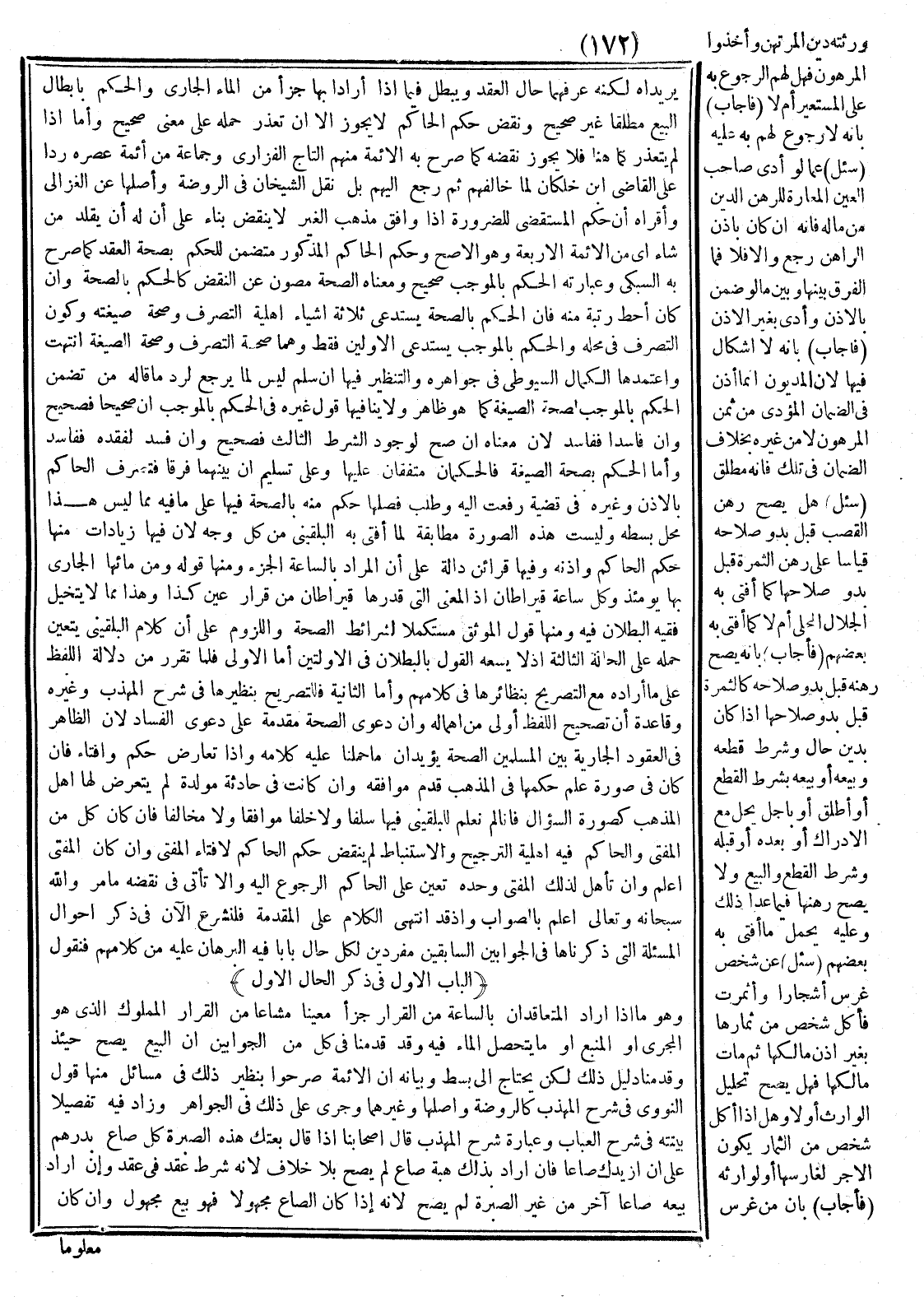(الْبَابُ الْأَوَّلُ فِي ذِكْرِ الْحَالِ الْأَوَّلِ) وَهُوَ مَا إذَا أَرَادَ الْمُتَعَاقِدَانِ بِالسَّاعَةِ مِنْ الْقَرَارِ جُزْءًا مُعَيَّنًا مُشَاعًا مِنْ الْقَرَارِ الْمَمْلُوكِ الَّذِي هُوَ الْمَجْرَى أَوْ الْمَنْبَعُ أَوْ مَا يَتَحَصَّلُ الْمَاءُ فِيهِ وَقَدْ قَدَّمْنَا فِي كُلٍّ مِنْ الْجَوَابَيْنِ أَنَّ الْبَيْعَ يَصِحُّ حِينَئِذٍ وَقَدَّمْنَا دَلِيلَ ذَلِكَ لَكِنْ يَحْتَاجُ إلَى بَسْطٍ وَبَيَانُهُ أَنَّ الْأَئِمَّةَ صَرَّحُوا بِنَظِيرِ ذَلِكَ فِي مَسَائِلَ مِنْهَا قَوْلُ النَّوَوِيِّ فِي شَرْحِ الْمُهَذَّبِ كَالرَّوْضَةِ وَأَصْلِهَا وَغَيْرِهِمَا وَجَرَى عَلَى ذَلِكَ فِي الْجَوَاهِرِ وَزَادَ فِيهِ تَفْصِيلًا بَيَّنْته فِي شَرْحِ الْعُبَابِ وَعِبَارَةُ شَرْحِ الْمُهَذَّبِ قَالَ أَصْحَابُنَا إذَا قَالَ بِعْتُك هَذِهِ الصُّبْرَةَ كُلَّ صَاعٍ بِدِرْهَمٍ عَلَى أَنْ أَزِيدَك صَاعًا فَإِنْ أَرَادَ بِذَلِكَ هِبَةَ صَاعٍ لَمْ يَصِحَّ بِلَا خِلَافٍ لِأَنَّهُ شَرْطُ عَقْدٍ فِي عَقْدٍ وَإِنْ أَرَادَ بَيْعَهُ صَاعًا آخَرَ مِنْ غَيْرِ الصُّبْرَةِ لَمْ يَصِحَّ لِأَنَّهُ إذَا كَانَ الصَّاع مَجْهُولًا فَهُوَ بَيْعٌ مَجْهُولٌ وَإِنْ كَانَ