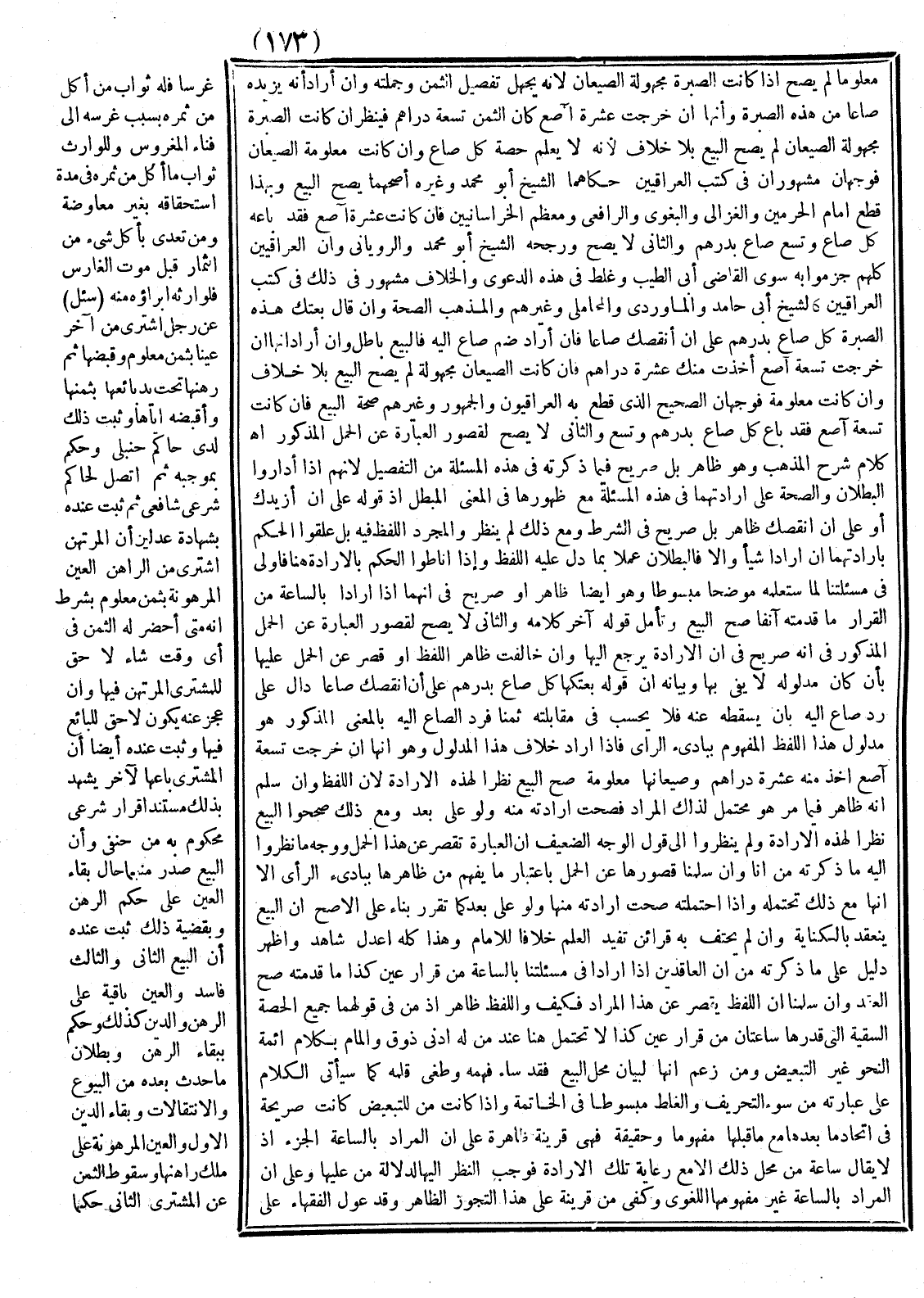 وَالْمُجَرَّدُ اللَّفْظُ فِيهِ بَلْ عَلَّقُوا الْحُكْمَ بِإِرَادَتِهِمَا إنْ أَرَادَا شَيْئًا وَإِلَّا فَالْبُطْلَانُ عَمَلًا بِمَا دَلَّ عَلَيْهِ اللَّفْظُ وَإِذَا أَنَاطُوا الْحُكْمَ بِالْإِرَادَةِ هُنَا فَأَوْلَى فِي مَسْأَلَتِنَا لِمَا سَتَعْلَمُهُ مُوَضَّحًا مَبْسُوطًا وَهُوَ أَيْضًا ظَاهِرٌ أَوْ صَرِيحٌ فِي أَنَّهُمَا إذَا أَرَادَا بِالسَّاعَةِ مِنْ الْقَرَارِ مَا قَدَّمْته آنِفًا صَحَّ الْبَيْعُ وَتَأَمَّلْ قَوْلَهُ آخِرَ كَلَامِهِ وَالثَّانِي لَا يَصِحُّ لِقُصُورِ الْعِبَارَةِ عَنْ الْحَمْلِ الْمَذْكُورِ فِي أَنَّهُ صَرِيحٌ فِي أَنَّ الْإِرَادَةَ يُرْجَعُ إلَيْهَا وَإِنْ خَالَفَتْ ظَاهِرَ اللَّفْظِ أَوْ قَصَّرَ عَنْ الْحَمْلِ عَلَيْهَا بِأَنْ كَانَ مَدْلُولُهُ لَا يَفِي بِهَا وَبَيَانُهُ أَنَّ قَوْلَهُ بِعْتُكهَا كُلَّ صَاعٍ بِدِرْهَمٍ عَلَى أَنْ أَنْقُصَك صَاعًا دَالٌّ عَلَى رَدِّ صَاعٍ إلَيْهِ بِأَنْ يُسْقِطَهُ عَنْهُ فَلَا يَحْسَبُ فِي مُقَابَلَتِهِ ثَمَنًا فَرَدَّ الصَّاعَ إلَيْهِ بِالْمَعْنَى الْمَذْكُورِ هُوَ مَدْلُولُ هَذَا اللَّفْظِ الْمَفْهُومِ بِبَادِئِ الرَّأْيِ فَإِذَا أَرَادَ خِلَافَ هَذَا الْمَدْلُولِ وَهُوَ أَنَّهَا إنْ خَرَجَتْ تِسْعَةَ آصُعٍ أُخِذَ مِنْهُ عَشْرَةُ دَرَاهِمَ وَصِيعَانُهَا مَعْلُومَة صَحَّ الْبَيْعُ نَظَرًا لِهَذِهِ الْإِرَادَةِ لِأَنَّ اللَّفْظَ.
