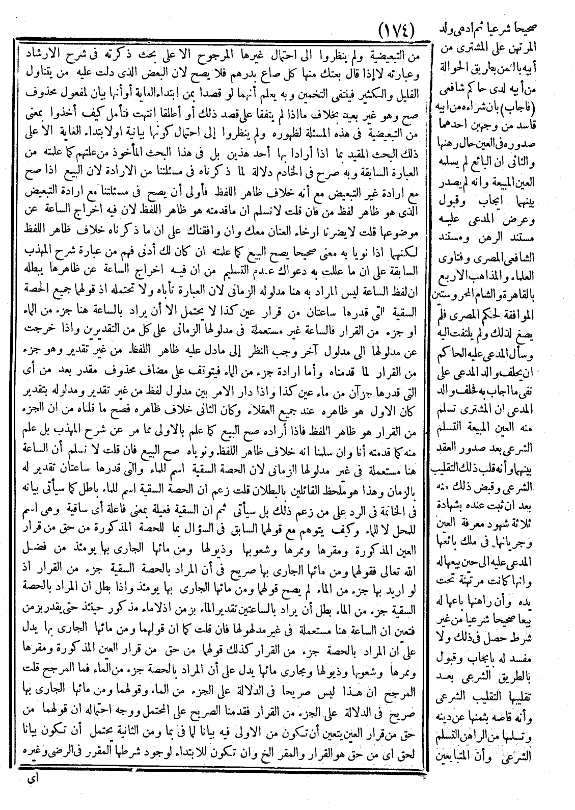 فَإِنْ قُلْت لَا نُسَلِّم أَنَّ السَّاعَة هُنَا مُسْتَعْمَلَة فِي غَيْر مَدْلُولهَا الزَّمَانِيّ لِأَنَّ الْحِصَّة السَّقِيَّة اسْم لِلْمَاءِ وَاَلَّتِي قَدْرهَا سَاعَتَانِ تَقْدِير لَهُ بِالزَّمَانِ وَهَذَا هُوَ مَلْحَظ الْقَائِلِينَ بِالْبُطْلَانِ قُلْت زَعَمَ أَنَّ الْحِصَّة السَّقِيَّة اسْم لِلْمَاءِ بَاطِل كَمَا سَيَأْتِي بَيَانه فِي الْخَاتِمَة فِي الرَّدّ عَلَى مِنْ زَعَمَ ذَلِكَ بَلْ سَيَأْتِي ثُمَّ إنَّ السَّقِيَّة فَعَيْلَة بِمَعْنَى فَاعِلَة أَيْ سَاقِيَة وَهِيَ اسْم لِلْمَحَلِّ لَا لِلْمَاءِ وَكَيْف يُتَوَهَّم مَعَ قَوْلهمَا السَّابِق فِي السُّؤَال بِمَا لِلْحِصَّةِ الْمَذْكُورَة مِنْ حَقٍّ مِنْ قَرَار الْعَيْن الْمَذْكُورَة وَمَقَرِّهَا وَمَمَرّهَا وَشُعُوبهَا وَذُيُولهَا وَمِنْ مَائِهَا الْجَارِي بِهَا يَوْمئِذٍ مِنْ فَضْل اللَّه تَعَالَى.