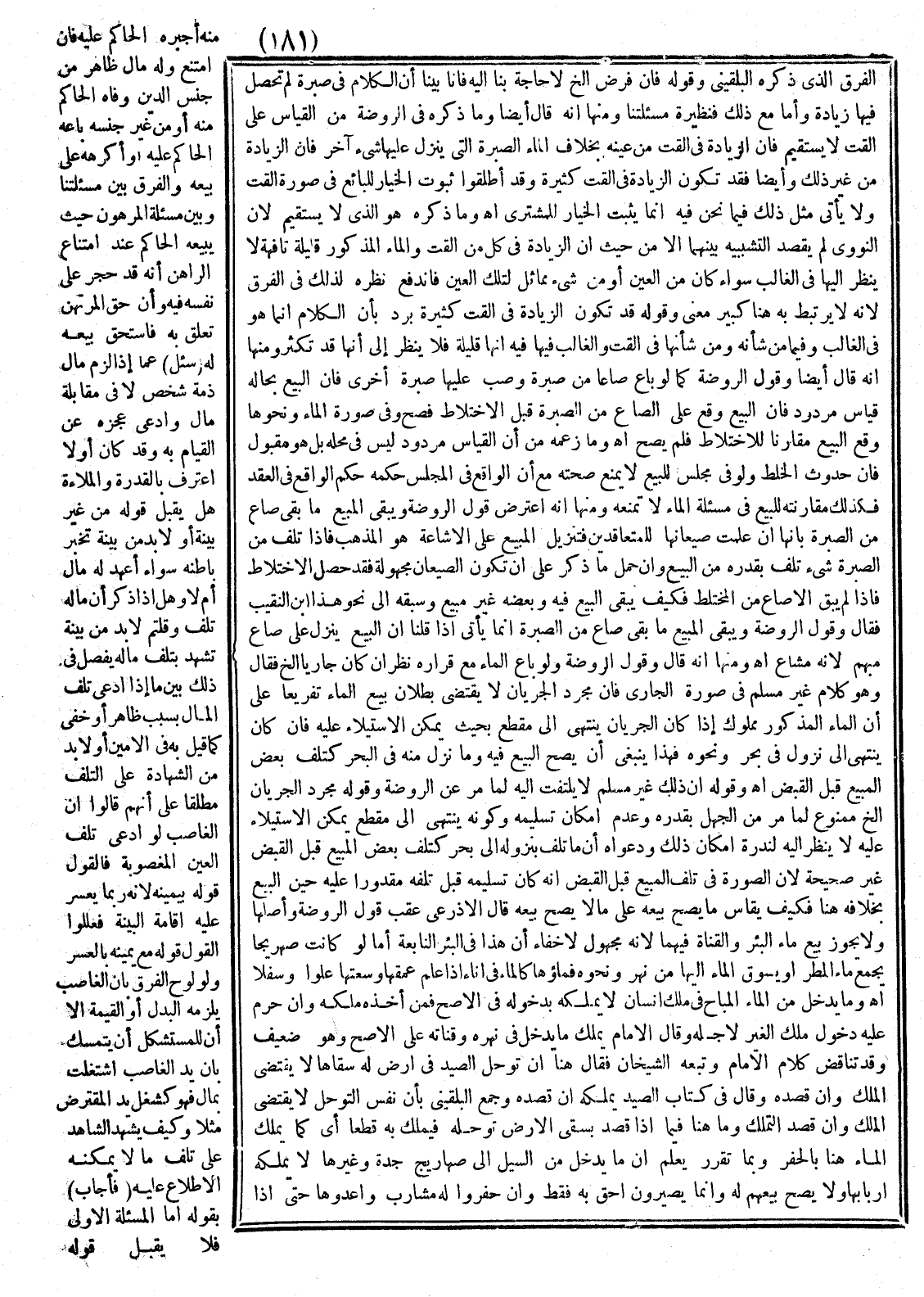 الْفَرْق الَّذِي ذَكَره الْبُلْقِينِيُّ وَقَوْله فَإِنْ فُرِضَ إلَخْ لَا حَاجَة بِنَا إلَيْهِ فَإِنَّا بَيَّنَّا أَنَّ الْكَلَامَ فِي صُبْرَةٍ لَمْ تَحْصُل فِيهَا زِيَادَة وَأَمَّا مَعَ ذَلِكَ فَنَظِيرَة مَسْأَلَتنَا وَمِنْهَا أَنَّهُ قَالَ أَيْضًا وَمَا ذَكَرَهُ فِي الرَّوْضَةِ مِنْ الْقِيَاس عَلَى الْقَتِّ لَا يَسْتَقِيم فَإِنَّ الزِّيَادَة فِي الْقَتِّ مِنْ عَيْنه بِخِلَافِ الْمَاءِ وَالصُّبْرَةِ الَّتِي يَنْزِل عَلَيْهَا شَيْء آخَر فَإِنَّ الزِّيَادَة مِنْ غَيْر ذَلِكَ وَأَيْضًا فَقَدْ تَكُون الزِّيَادَة فِي الْقَتِّ كَثِيرَة.