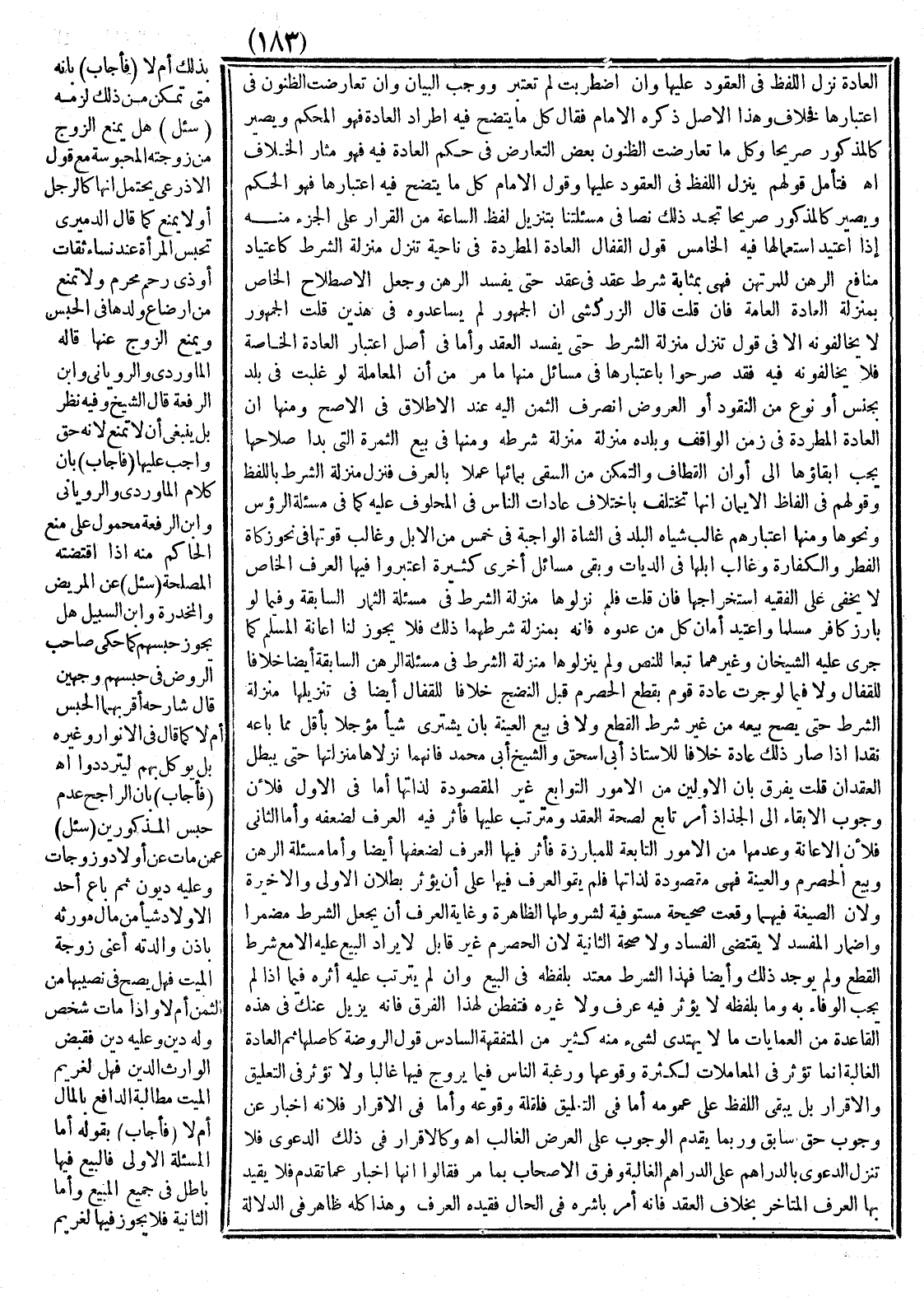 وَكُلُّ مَا تَعَارَضَتْ الظُّنُونُ بَعْضَ التَّعَارُضِ فِي حُكْمِ الْعَادَةِ فِيهِ فَهُوَ مَثَارُ الْخِلَافِ اهـ فَتَأَمَّلْ قَوْلَهُمْ يَنْزِلُ اللَّفْظُ فِي الْعُقُودِ عَلَيْهَا وَقَوْلُ الْإِمَامِ كُلُّ مَا يَتَّضِحُ فِيهِ اعْتِبَارُهَا فَهُوَ الْحُكْمُ وَيَصِيرُ كَالْمَذْكُورِ صَرِيحًا تَجِدُ ذَلِكَ نَصًّا فِي مَسْأَلَتِنَا بِتَنْزِيلِ لَفْظِ السَّاعَةِ مِنْ الْقَرَارِ عَلَى الْجُزْءِ مِنْهُ إذَا اُعْتِيدَ اسْتِعْمَالُهَا فِيهِ الْخَامِسُ قَوْلُ الْقَفَّالِ الْعَادَةُ الْمُطَّرِدَةُ فِي نَاحِيَةٍ تَنْزِلُ مَنْزِلَةَ الشَّرْطِ كَاعْتِيَادِ مَنَافِعِ الرَّهْنِ لِلْمُرْتَهِنِ فَهِيَ بِمَثَابَةِ شَرْطِ عَقْدٍ فِي عَقْدٍ حَتَّى يَفْسُدَ الرَّهْنُ وَجَعَلَ الِاصْطِلَاحَ الْخَاصَّ بِمَنْزِلَةِ الْعَادَةِ الْعَامَّةِ فَإِنْ قُلْتَ قَالَ الزَّرْكَشِيُّ إنَّ الْجُمْهُورَ لَمْ يُسَاعِدُوهُ فِي هَذَيْنِ قُلْت الْجُمْهُورُ لَا يُخَالِفُونَهُ إلَّا فِي قَوْلِهِ تَنْزِلُ مَنْزِلَةَ الشَّرْطِ حَتَّى يَفْسُدَ الْعَقْدُ وَأَمَّا فِي أَصْلِ اعْتِبَارِ الْعَادَةِ الْخَاصَّةِ فَلَا يُخَالِفُونَهُ فِيهِ فَقَدْ صَرَّحُوا بِاعْتِبَارِهَا فِي مَسَائِلَ مِنْهَا مَا مَرَّ مِنْ أَنَّ الْمُعَامَلَةَ لَوْ غَلَبَتْ فِي بَلَدٍ بِجِنْسٍ أَوْ نَوْعٍ مِنْ النُّقُودِ أَوْ الْعُرُوضِ انْصَرَفَ الثَّمَنُ إلَيْهِ عِنْدَ الْإِطْلَاقِ فِي الْأَصَحِّ.