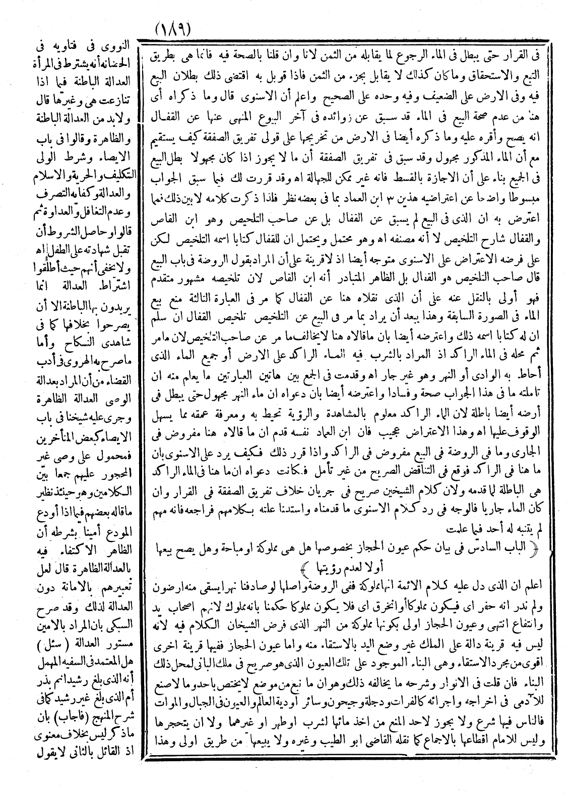 (الْبَابُ السَّادِسُ فِي بَيَانِ حُكْمِ عُيُونِ الْحِجَازِ بِخُصُوصِهَا هَلْ هِيَ مَمْلُوكَةٌ أَوْ مُبَاحَةٌ وَهَلْ يَصِحُّ بَيْعُهَا أَوْ لَا لِعَدَمِ رُؤْيَتِهَا) اعْلَمْ أَنَّ الَّذِي دَلَّ عَلَيْهِ كَلَامُ الْأَئِمَّةِ أَنَّهَا مَمْلُوكَةٌ فَفِي الرَّوْضَةِ وَأَصْلِهَا لَوْ صَادَفْنَا نَهْرًا يُسْقَى مِنْهُ أَرْضُونَ وَلَمْ نَدْرِ أَنَّهُ حَفْرٌ أَيْ فَيَكُونُ مَمْلُوكًا أَوْ انْخَرَقَ أَيْ فَلَا يَكُونُ مَمْلُوكًا حَكَمْنَا بِأَنَّهُ مَمْلُوكٌ لِأَنَّهُمْ أَصْحَابُ يَدٍ وَانْتِفَاعٍ اهـ وَعُيُونُ الْحِجَازِ أَوْلَى بِكَوْنِهَا مَمْلُوكَةً مِنْ النَّهْرِ الَّذِي فَرَضَ الشَّيْخَانِ الْكَلَامَ فِيهِ لِأَنَّهُ لَيْسَ فِيهِ قَرِينَةٌ دَالَّةٌ عَلَى الْمِلْكِ غَيْر وَضْعِ الْيَدِ بِالِاسْتِقَاءِ مِنْهُ وَأَمَّا عُيُونُ الْحِجَازِ فَفِيهَا قَرِينَةٌ أُخْرَى أَقْوَى مِنْ مُجَرَّدِ الِاسْتِقَاء وَهِيَ الْبِنَاءُ الْمَوْجُودُ عَلَى تِلْكَ الْعُيُونِ الَّذِي هُوَ صَرِيحٌ فِي مِلْكِ الْبَانِي لِمَحَلِّ ذَلِكَ الْبِنَاءِ فَإِنْ قُلْت فِي الْأَنْوَارِ وَشَرْحِهِ مَا يُخَالِفُ ذَلِكَ وَهُوَ أَنَّ مَا نَبَعَ مِنْ مَوْضِعٍ لَا يَخْتَصُّ بِأَحَدٍ وَمَا لَا صُنْعَ لِلْآدَمِيِّ فِي إخْرَاجِهِ وَإِجْرَائِهِ كَالْفُرَاتِ وَدِجْلَةَ وَجَيْحُونَ وَسَائِرِ أَوْدِيَةِ الْعَالَمِ وَالْعُيُونِ فِي الْجِبَالِ وَالْمَوَاتِ فَالنَّاسُ فِيهَا شَرْعٌ وَلَا يَجُوزُ لِأَحَدٍ الْمَنْعُ مِنْ أَخْذِ مَائِهَا لِشُرْبٍ أَوْ طُهْرٍ أَوْ غَيْرِهِمَا وَلَا أَنْ يَتَحَجَّرَهَا.