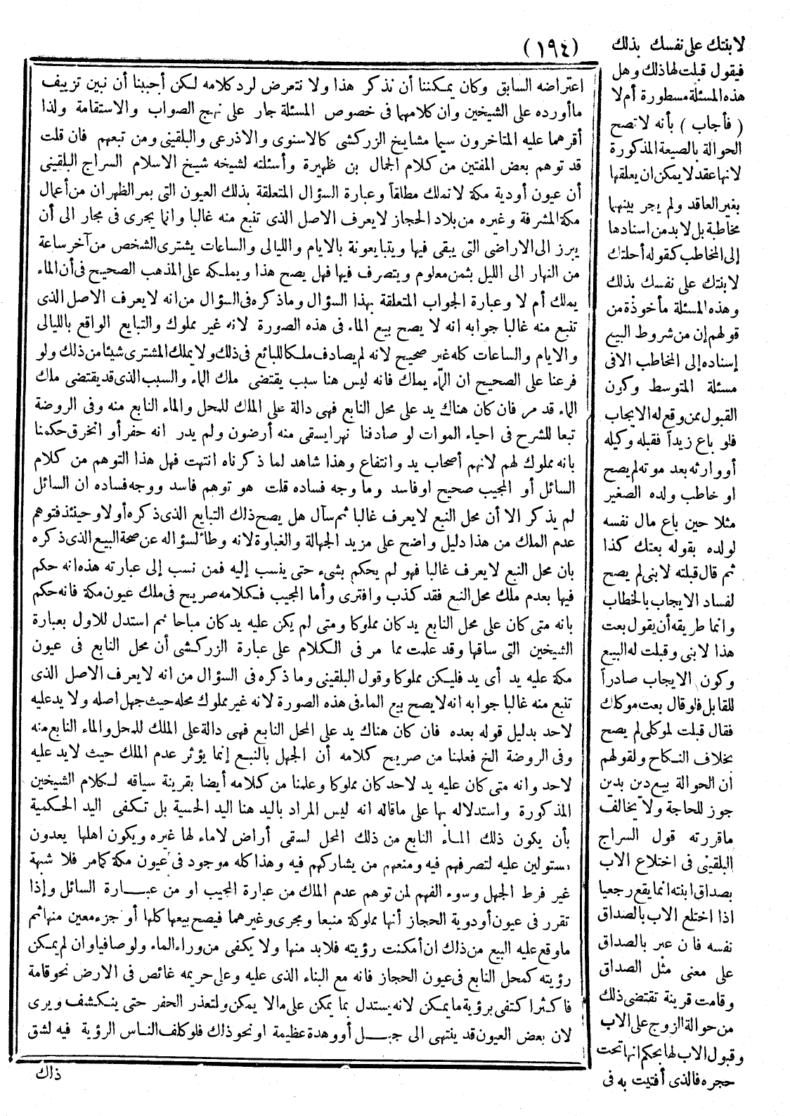 فَإِنْ قُلْتَ قَدْ تَوَهَّمَ بَعْضُ الْمُفْتِينَ مِنْ كَلَامِ الْجَمَّالِ بْنِ ظَهِيرَةَ وَأَسْئِلَتِهِ لِشَيْخِهِ شَيْخِ الْإِسْلَامِ السِّرَاجِ الْبُلْقِينِيُّ أَنَّ عُيُونَ أَوْدِيَةِ مَكَّةَ لَا تُمَلَّكُ مُطْلَقًا وَعِبَارَةُ السُّؤَالِ الْمُتَعَلِّقَةُ بِتِلْكَ الْعُيُونِ الَّتِي بِمَرِّ الظَّهْرَانِ مِنْ أَعْمَالِ مَكَّةَ الْمُشَرَّفَةِ وَغَيْرِهِ مِنْ بِلَادِ الْحِجَازِ لَا يُعْرَفُ الْأَصْلُ الَّذِي تَنْبُعُ مِنْهُ غَالِبًا وَإِنَّمَا يَجْرِي فِي مَجَارٍ إلَى أَنْ يَبْرُزَ إلَى الْأَرَاضِي الَّتِي يَبْقَى فِيهَا وَيَتَبَايَعُونَهُ بِالْأَيَّامِ وَاللَّيَالِي وَالسَّاعَاتِ يَشْتَرِي الشَّخْصُ مِنْ آخِرِ سَاعَةٍ مِنْ النَّهَارِ إلَى اللَّيْلِ بِثَمَنٍ مَعْلُومٍ وَيَتَصَرَّفُ فِيهَا فَهَلْ يَصِحُّ هَذَا وَيَمْلِكُهُ عَلَى الْمَذْهَبِ الصَّحِيحِ فِي أَنَّ الْمَاءَ يُمَلَّكُ أَمْ لَا وَعِبَارَةُ الْجَوَابِ الْمُتَعَلِّقَةُ بِهَذَا السُّؤَالِ وَمَا ذَكَرَهُ فِي السُّؤَالِ مِنْ أَنَّهُ لَا يُعْرَفُ الْأَصْلُ الَّذِي تَنْبُعُ مِنْهُ غَالِبًا جَوَابُهُ أَنَّهُ لَا يَصِحُّ بَيْعُ الْمَاءِ فِي هَذِهِ الصُّورَةِ لِأَنَّهُ غَيْرُ مَمْلُوكٍ وَالتَّبَايُعُ الْوَاقِعُ بِاللَّيَالِيِ وَالْأَيَّامِ وَالسَّاعَاتِ كُلُّهُ غَيْرُ صَحِيحٍ لِأَنَّهُ لَمْ يُصَادِفْ مِلْكًا لِلْبَائِعِ فِي ذَلِكَ وَلَا يَمْلِكُ الْمُشْتَرِي شَيْئًا مِنْ ذَلِكَ.