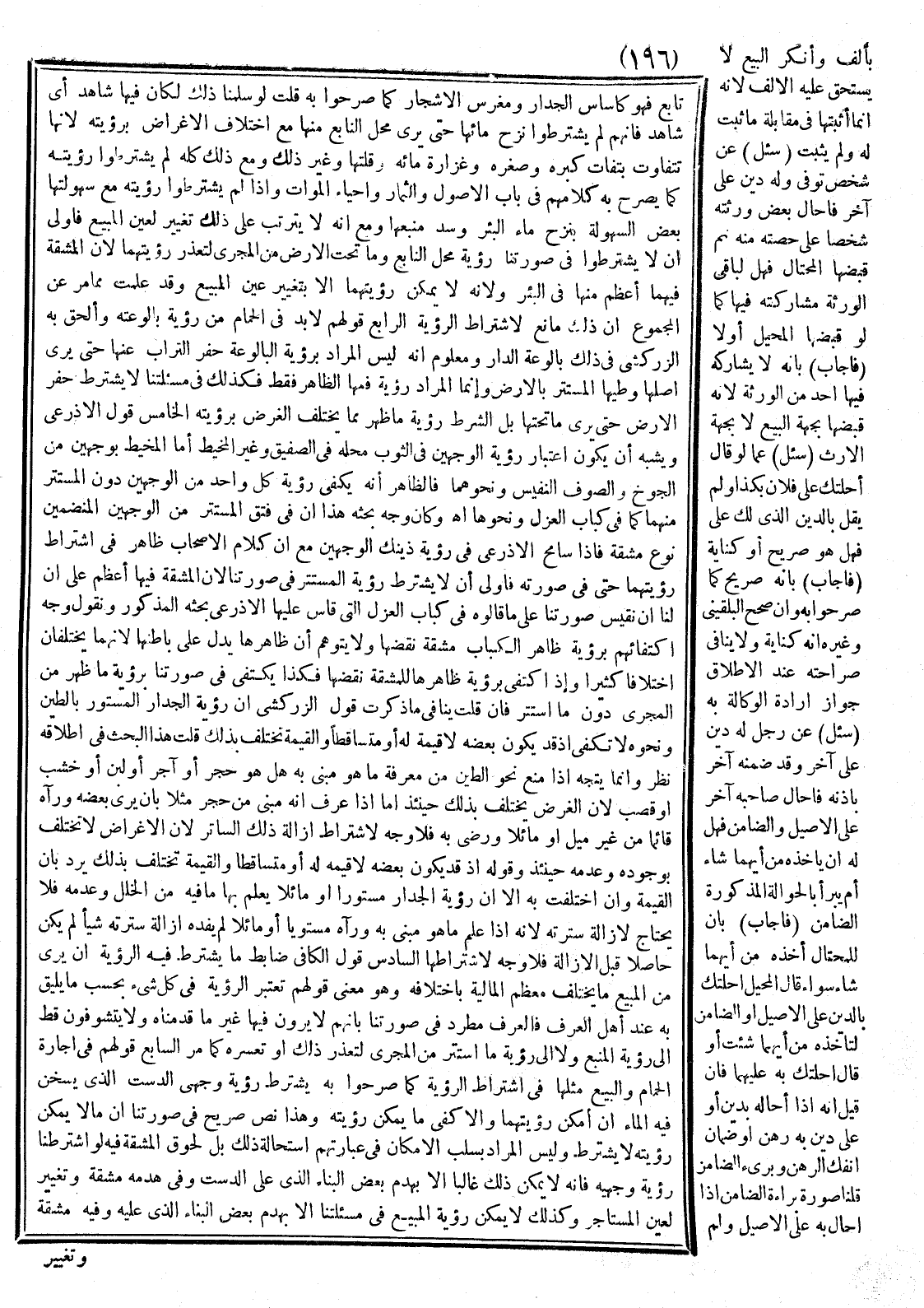 الرَّابِعُ قَوْلُهُمْ لَا بُدَّ فِي الْحَمَّامِ مِنْ رُؤْيَةِ بَالُوعَتِهِ وَأَلْحَقَ بِهِ الزَّرْكَشِيُّ فِي ذَلِكَ بَالُوعَةَ الدَّارِ وَمَعْلُومٌ أَنَّهُ لَيْسَ الْمُرَادُ بِرُؤْيَةِ الْبَالُوعَةِ حَفْرَ التُّرَابِ عَنْهَا حَتَّى يُرَى أَصْلُهَا وَطَيُّهَا الْمُسْتَتِرُ بِالْأَرْضِ وَإِنَّمَا الْمُرَادُ رُؤْيَةُ فَمِهَا الظَّاهِرِ فَقَطْ فَكَذَلِكَ فِي مَسْأَلَتِنَا لَا يُشْتَرَطُ حَفْرُ الْأَرْضِ حَتَّى يُرَى مَا تَحْتَهَا بَلْ الشَّرْطُ رُؤْيَةُ مَا ظَهَرَ مِمَّا يَخْتَلِفُ الْغَرَضُ بِرُؤْيَتِهِ الْخَامِسُ قَوْلُ الْأَذْرَعِيِّ وَيُشْبِهُ أَنْ يَكُونَ اعْتِبَارُ رُؤْيَةِ الْوَجْهَيْنِ فِي الثَّوْبِ مَحَلُّهُ فِي الصَّفِيقِ وَغَيْرِ الْمَخِيطِ أَمَّا الْمَخِيطُ بِوَجْهَيْنِ مِنْ الْجُوخِ وَالصُّوفِ النَّفِيسِ وَنَحْوِهِمَا فَالظَّاهِرُ أَنَّهُ يَكْفِي رُؤْيَةُ كُلِّ وَاحِدٍ مِنْ الْوَجْهَيْنِ دُونَ الْمُسْتَتِر مِنْهُمَا كَمَا فِي كُبَابِ الْغَزْلِ وَنَحْوِهَا اهـ وَكَانَ وَجْهُ بَحْثِهِ هَذَا أَنَّ فِي فَتْقِ الْمُسْتَتِرِ مِنْ الْوَجْهَيْنِ الْمُنْضَمَّيْنِ نَوْعَ مَشَقَّةٍ فَإِذَا سَامَحَ الْأَذْرَعِيُّ فِي رُؤْيَةِ ذَيْنِكَ الْوَجْهَيْنِ مَعَ أَنَّ كَلَامَ الْأَصْحَابِ ظَاهِرٌ فِي اشْتِرَاطِ رُؤْيَتِهِمَا حَتَّى فِي صُورَتِهِ فَأَوْلَى أَنْ لَا يُشْتَرَطَ رُؤْيَةُ الْمُسْتَتِرِ فِي صُورَتِنَا لِأَنَّ الْمَشَقَّةَ فِيهَا أَعْظَمُ عَلَى أَنَّ لَنَا أَنَّ نَقِيسَ صُورَتنَا عَلَى مَا قَالُوهُ فِي كُبَابِ الْغَزْلِ الَّتِي قَاسَ عَلَيْهَا الْأَذْرَعِيُّ بَحْثَهُ الْمَذْكُورَ.