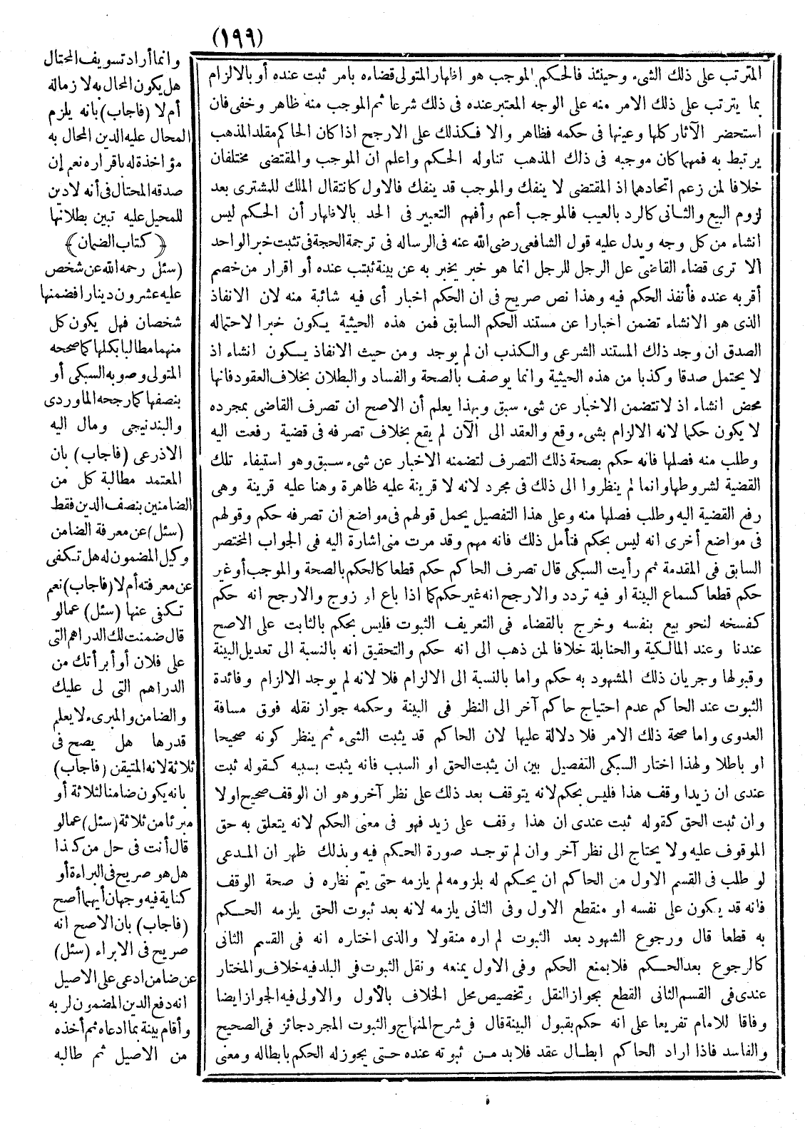 وَإِنَّمَا لَمْ يَنْظُرُوا إلَى ذَلِكَ فِي مُجَرَّدٍ لِأَنَّهُ لَا قَرِينَةَ عَلَيْهِ ظَاهِرَةٌ وَهُنَا عَلَيْهِ قَرِينَةٌ وَهِيَ رَفْعُ الْقَضِيَّةِ إلَيْهِ وَطَلَبُ فَصْلِهَا مِنْهُ وَعَلَى هَذَا التَّفْصِيلِ يُحْمَلُ قَوْلُهُمْ فِي مَوَاضِعَ إنَّ تَصَرُّفَهُ حُكْمٌ وَقَوْلُهُمْ فِي مَوَاضِعَ أُخْرَى إنَّهُ لَيْسَ بِحُكْمٍ فَتَأَمَّلْ ذَلِكَ فَإِنَّهُ مُهِمٌّ وَقَدْ مَرَّتْ مِنِّي إشَارَةٌ إلَيْهِ فِي الْجَوَابِ الْمُخْتَصَرِ السَّابِقِ فِي الْمُقَدِّمَةِ ثُمَّ رَأَيْتُ السُّبْكِيّ قَالَ تَصَرُّفُ الْحَاكِمِ حُكْمٌ قَطْعًا كَالْحُكْمِ بِالصِّحَّةِ وَالْمُوجَبِ أَوْ غَيْرُ حُكْمٍ قَطْعًا كَسَمَاعِ الْبَيِّنَةِ أَوْ فِيهِ تَرَدُّدٌ وَالْأَرْجَحُ أَنَّهُ غَيْرُ حُكْمٍ كَمَا إذَا بَاعَ أَوْ زَوَّجَ وَالْأَرْجَحُ أَنَّهُ حُكْمٌ كَفَسْخِهِ لِنَحْوِ بَيْعٍ بِنَفْسِهِ وَخَرَجَ بِالْقَضَاءِ فِي التَّعْرِيفِ الثُّبُوتُ فَلَيْسَ بِحُكْمٍ بِالثَّابِتِ عَلَى الْأَصَحِّ عِنْدَنَا وَعِنْدَ الْمَالِكِيَّةِ وَالْحَنَابِلَةِ خِلَافًا لِمَنْ ذَهَبَ إلَى أَنَّهُ حُكْمٌ وَالتَّحْقِيقُ أَنَّهُ بِالنِّسْبَةِ إلَى تَعْدِيلِ الْبَيِّنَةِ وَقَبُولِهَا وَجَرَيَانِ ذَلِكَ الْمَشْهُودِ بِهِ حُكْمٌ وَأَمَّا بِالنِّسْبَةِ إلَى الْإِلْزَامِ فَلَا لِأَنَّهُ لَمْ يُوجَدْ الْإِلْزَامُ وَفَائِدَةُ الثُّبُوتِ عِنْدَ الْحَاكِمِ عَدَمُ احْتِيَاجِ حَاكِمٍ آخَرَ إلَى النَّظَرِ فِي الْبَيِّنَةِ وَحُكْمُهُ جَوَازُ نَقْلِهِ فَوْقَ مَسَافَةِ الْعَدْوَى وَأَمَّا صِحَّةُ ذَلِكَ الْأَمْرِ فَلَا دَلَالَةَ عَلَيْهَا لِأَنَّ الْحَاكِمَ قَدْ يُثْبِتُ الشَّيْءَ ثُمَّ يَنْظُرُ كَوْنَهُ صَحِيحًا أَوْ بَاطِلًا.