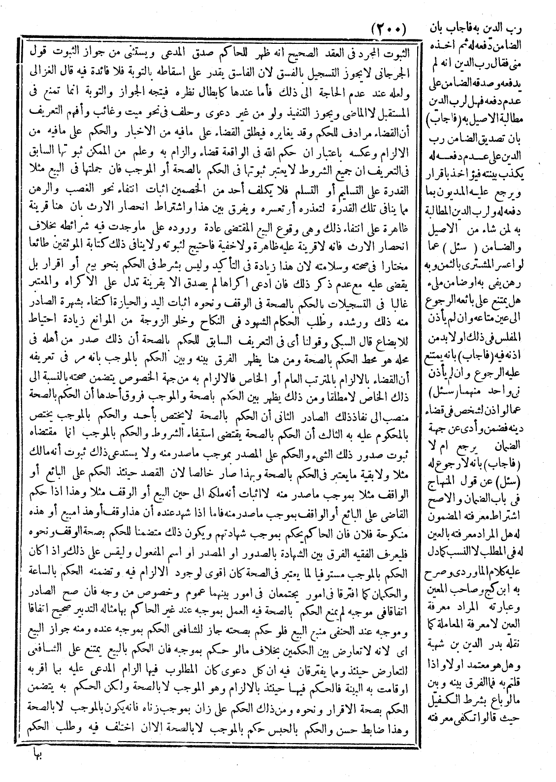 فَالْإِلْزَامُ بِهِ مِنْ جِهَةِ الْخُصُوصِ يَتَضَمَّنُ صِحَّتَهُ بِالنِّسْبَةِ إلَى ذَلِكَ الْخَاصِّ لَا مُطْلَقًا وَمِنْ ذَلِكَ يَظْهَرُ بَيْنَ الْحُكْمِ بِالصِّحَّةِ وَالْمُوجَبِ فُرُوقٌ أَحَدُهَا أَنَّ الْحُكْمَ بِالصِّحَّةِ مُنْصَبٌّ إلَى نَفَاذِ ذَلِكَ الصَّادِرِ الثَّانِي أَنَّ الْحُكْمَ بِالصِّحَّةِ لَا يَخْتَصُّ بِأَحَدٍ وَالْحُكْمُ بِالْمُوجَبِ يَخْتَصُّ بِالْمَحْكُومِ عَلَيْهِ بِهِ الثَّالِثُ أَنَّ الْحُكْمَ بِالصِّحَّةِ يَقْتَضِي اسْتِيفَاءَ الشُّرُوطِ وَالْحُكْمَ بِالْمُوجَبِ إنَّمَا مُقْتَضَاهُ ثُبُوتُ صُدُورِ ذَلِكَ الشَّيْءِ وَالْحُكْمِ عَلَى الْمَصْدَرِ بِمُوجَبِ مَا صَدَرَ مِنْهُ وَلَا يَسْتَدْعِي ذَلِكَ ثُبُوتُ أَنَّهُ مَالِكٌ مَثَلًا وَلَا بَقِيَّةَ مَا يُعْتَبَرُ فِي الْحُكْمِ بِالصِّحَّةِ وَبِهَذَا صَارَ خَالِصًا لِأَنَّ الْقَصْدَ حِينَئِذٍ الْحُكْمُ عَلَى الْبَائِعِ أَوْ الْوَاقِفِ مَثَلًا بِمُوجَبِ مَا صَدَرَ مِنْهُ لَا إثْبَاتُ أَنَّهُ مَلَكَهُ إلَى حِينِ الْبَيْعِ أَوْ الْوَقْفِ مَثَلًا وَهَذَا إذَا حَكَمَ الْقَاضِي عَلَى الْبَائِعِ أَوْ الْوَاقِفِ بِمُوجَبِ مَا صَدَرَ مِنْهُ فَأَمَّا إذَا شَهِدَ عِنْدَهُ أَنَّ هَذَا وَقْفٌ أَوْ هَذَا مَبِيعٌ أَوْ هَذِهِ مَنْكُوحَةُ فُلَانٍ فَإِنَّ الْحَاكِمَ يَحْكُمُ بِمُوجَبِ شَهَادَتِهِمْ وَيَكُونُ ذَلِكَ مُتَضَمِّنًا لِلْحُكْمِ بِصِحَّةِ الْوَقْفِ وَنَحْوِهِ فَلْيَعْرِفْ الْفَقِيهُ الْفَرْقَ بَيْنَ الشَّهَادَةِ بِالصُّدُورِ أَوْ الْمَصْدَرِ أَوْ اسْمِ الْمَفْعُولِ وَلْيَقِسْ عَلَى ذَلِكَ وَإِذَا كَانَ الْحُكْمُ بِالْمُوجَبِ مُسْتَوْفِيًا لِمَا يُعْتَبَرُ فِي الصِّحَّةِ كَانَ أَقْوَى لِوُجُودِ الْإِلْزَامِ فِيهِ وَتَضَمُّنِهِ الْحُكْمَ بِالصِّحَّةِ وَالْحُكْمَانِ كَمَا افْتَرَقَا فِي أُمُورٍ يَجْتَمِعَانِ فِي أُمُورٍ بَيْنَهُمَا عُمُومٌ وَخُصُوصٌ مِنْ وَجْهٍ.