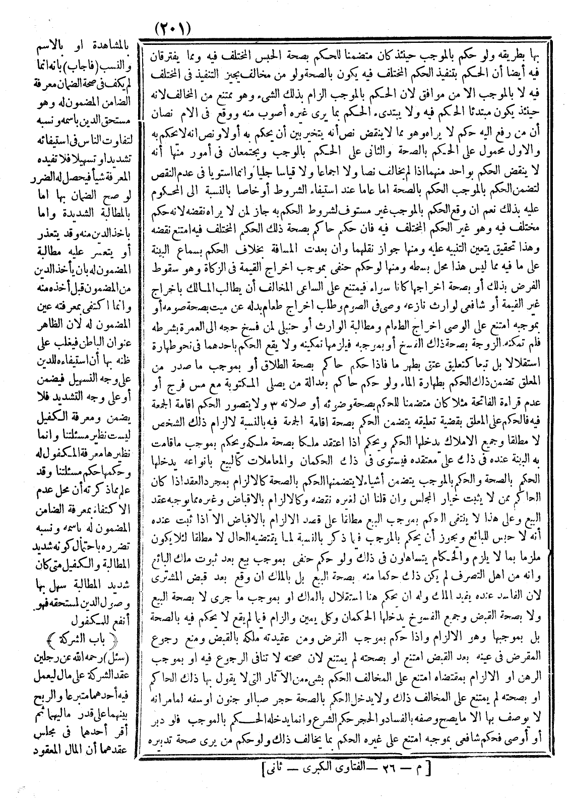 وَمِنْهَا لَوْ حَكَمَ حَنَفِيٌّ بِمُوجَبِ إخْرَاجِ الْقِيمَةِ فِي الزَّكَاةِ وَهُوَ سُقُوطُ الْفَرْضِ بِذَلِكَ أَوْ بِصِحَّةِ إخْرَاجِهَا كَانَا سَوَاءً فَيَمْتَنِعُ عَلَى السَّاعِي الْمُخَالِفِ أَنْ يُطَالِبَ الْمَالِكَ بِإِخْرَاجِ غَيْرِ الْقِيمَةِ أَوْ شَافِعِيٌّ لِوَارِثِ نَازَعَهُ وَصِيٌّ فِي الصَّوْمِ وَطَلَبَ إخْرَاجَ طَعَامٍ بَدَلَهُ عَنْ مَيْتٍ بِصِحَّةِ صَوْمِهِ أَوْ بِمُوجَبِهِ امْتَنَعَ عَلَى الْوَصِيِّ إخْرَاجُ الطَّعَامِ وَمُطَالَبَةُ الْوَارِثِ أَوْ حَنْبَلِيٌّ لِمَنْ فَسَخَ حَجَّهُ إلَى الْعُمْرَةِ بِشَرْطِهِ فَلَمْ تُمَكِّنْهُ الزَّوْجَةُ بِصِحَّةِ ذَلِكَ الْفَسْخِ أَوْ بِمُوجَبِهِ فَيَلْزَمُهَا تَمْكِينُهُ وَلَا يَقَعُ الْحُكْمُ بِأَحَدِهِمَا فِي نَحْوِ طَهَارَةٍ اسْتِقْلَالًا بَلْ تَبَعًا كَتَعْلِيقِ عِتْقٍ بِطُهْرٍ مَا فَإِذَا حَكَمَ حَاكِمٌ بِصِحَّةِ الطَّلَاقِ أَوْ بِمُوجَبِ مَا صَدَرَ مِنْ الْمُعَلَّقِ تَضَمَّنَ ذَلِكَ الْحُكْمَ بِطَهَارَةِ الْمَاءِ وَلَوْ حَكَمَ حَاكِمٌ بِعَدَالَةِ مَنْ يُصَلِّي الْمَكْتُوبَةَ مَعَ مَسِّ فَرْجٍ أَوْ عَدَمِ قِرَاءَةِ الْفَاتِحَةِ مَثَلًا كَانَ مُتَضَمِّنًا لِلْحُكْمِ بِصِحَّةِ وُضُوئِهِ أَوْ صَلَاتِهِ وَلَا يُتَصَوَّرُ الْحُكْمُ إقَامَةَ الْجُمُعَةِ فِيهِ فَالْحُكْمُ عَلَى الْمُعَلَّقِ بِقَضِيَّةِ تَعْلِيقِهِ يَتَضَمَّنُ الْحُكْمَ بِصِحَّةِ إقَامَةِ الْجُمُعَة فِيهِ بِالنِّسْبَةِ لِإِلْزَامِ ذَلِكَ الشَّخْصِ لَا مُطْلَقًا وَجَمِيعُ الْأَمْلَاكِ يَدْخُلُهَا الْحُكْمُ وَيَحْكُمُ إذَا اعْتَقَدَ مِلْكًا بِصِحَّةِ مِلْكِهِ.