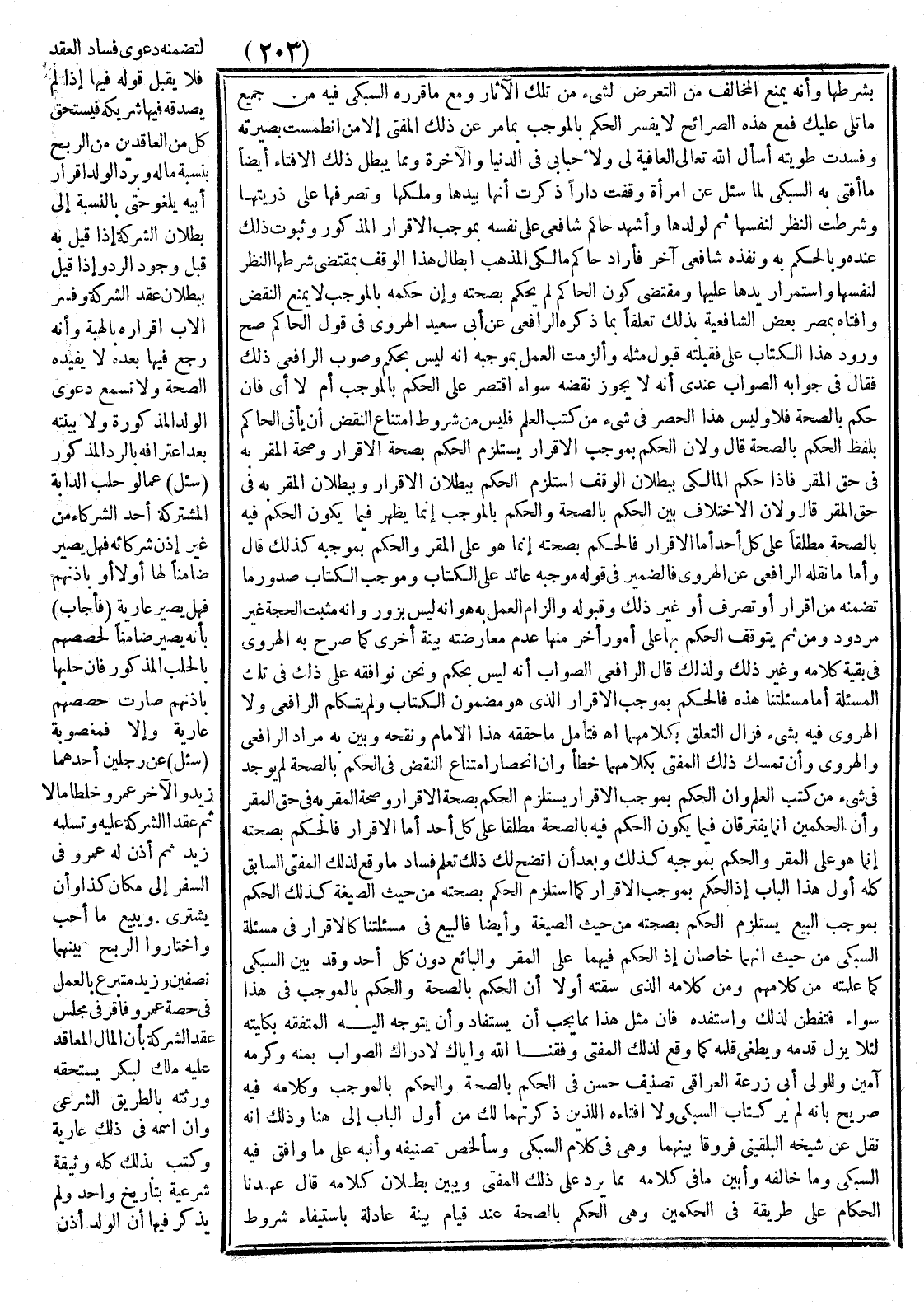 وَلَمْ يَتَكَلَّمْ الرَّافِعِيُّ وَلَا الْهَرَوِيُّ فِيهِ بِشَيْءٍ فَزَالَ التَّعَلُّقُ بِكَلَامِهِمَا اهـ فَتَأَمَّلْ مَا حَقَّقَهُ هَذَا الْإِمَامُ وَنَقَّحَهُ وَبَيَّنَ بِهِ مُرَادَ الرَّافِعِيِّ وَالْهَرَوِيِّ وَأَنَّ تَمَسُّكَ ذَلِكَ الْمُفْتِي بِكَلَامِهِمَا خَطَأٌ وَأَنَّ انْحِصَارَ امْتِنَاعِ النَّقْضِ فِي الْحُكْمِ بِالصِّحَّةِ لَمْ يُوجَدْ فِي شَيْءٍ مِنْ كُتُبِ الْعِلْمِ وَأَنَّ الْحُكْمَ بِمُوجَبِ الْإِقْرَارِ يَسْتَلْزِمُ الْحُكْمَ بِصِحَّةِ الْإِقْرَارِ وَصِحَّةِ الْمُقَرّ بِهِ فِي حَقِّ الْمُقِرِّ وَأَنَّ الْحُكْمَيْنِ إنَّمَا يَفْتَرِقَانِ فِيمَا يَكُونُ الْحُكْمُ فِيهِ بِالصِّحَّةِ مُطْلَقًا عَلَى كُلِّ أَحَدٍ أَمَّا الْإِقْرَارُ فَالْحُكْمُ بِصِحَّتِهِ إنَّمَا هُوَ عَلَى الْمُقِرِّ وَالْحُكْمُ بِمُوجَبِهِ كَذَلِكَ وَبَعْدَ أَنْ اتَّضَحَ لَك ذَلِكَ تَعَلَّمْ فَسَادَ مَا وَقَعَ لِذَلِكَ الْمُفْتِي السَّابِقِ كُلَّهُ أَوَّلَ هَذَا الْبَابِ إذْ الْحُكْمُ بِمُوجَبِ الْإِقْرَارِ كَمَا اسْتَلْزَمَ الْحُكْمَ بِصِحَّتِهِ مِنْ حَيْثُ الصِّيغَةُ كَذَلِكَ الْحُكْمُ بِمُوجَبِ الْبَيْعِ يَسْتَلْزِمُ الْحُكْمَ بِصِحَّتِهِ مِنْ حَيْثُ الصِّيغَةُ وَأَيْضًا فَالْبَيْعُ فِي مَسْأَلَتِنَا كَالْإِقْرَارِ فِي مَسْأَلَةِ السُّبْكِيّ مِنْ حَيْثُ إنَّهُمَا خَاصَّانِ إذْ الْحُكْمُ فِيهِمَا عَلَى الْمُقِرِّ وَالْبَائِعِ دُونَ كُلِّ أَحَدٍ.