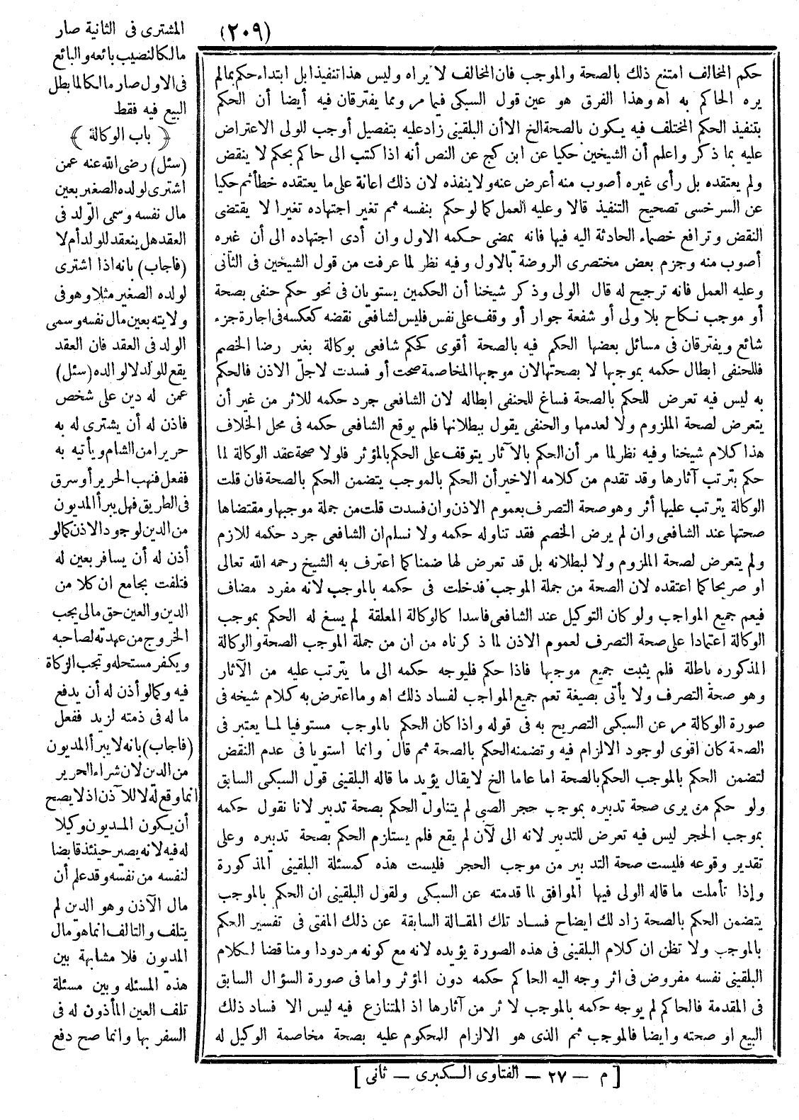 وَأَمَّا فِي صُورَةِ السُّؤَالِ السَّابِقِ فِي الْمُقَدِّمَةِ فَالْحَاكِمُ لَمْ يُوَجِّهْ حُكْمَهُ بِالْمُوجَبِ لِأَثَرٍ مِنْ آثَارِهَا إذْ الْمُتَنَازَعُ فِيهِ لَيْسَ إلَّا فَسَادُ ذَلِكَ الْبَيْعِ أَوْ صِحَّتُهُ وَأَيْضًا فَالْمُوجَب ثُمَّ الَّذِي هُوَ الْإِلْزَامُ لِلْمَحْكُومِ عَلَيْهِ بِصِحَّةِ مُخَاصِمَةِ الْوَكِيلِ لَهُ