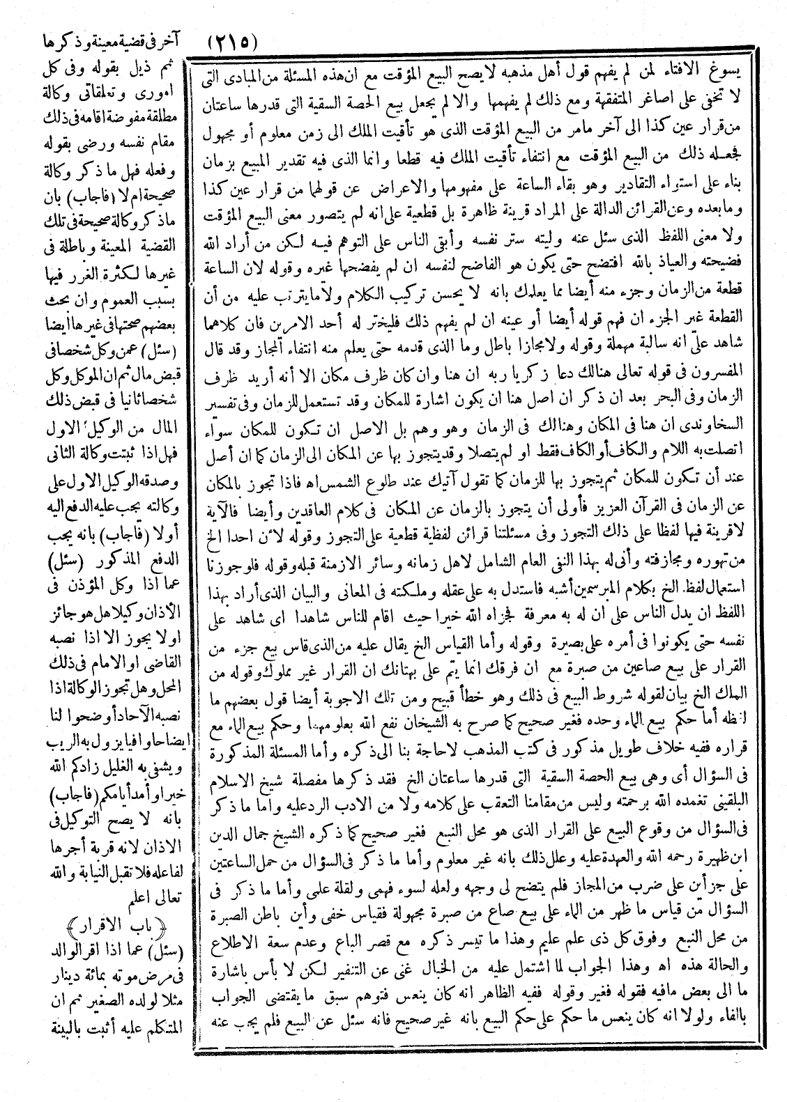 يُسَوَّغُ الْإِفْتَاءُ لِمَنْ لَمْ يَفْهَمْ قَوْلَ أَهْلِ مَذْهَبِهِ لَا يَصِحُّ الْبَيْعُ الْمُؤَقَّتُ مَعَ أَنَّ هَذِهِ الْمَسْأَلَةَ مِنْ الْمَبَادِئِ الَّتِي لَا تَخْفَى عَلَى أَصَاغِرِ الْمُتَفَقِّهَةِ وَمَعَ ذَلِكَ لَمْ يَفْهَمْهَا وَإِلَّا لَمْ يَجْعَلْ بَيْعَ الْحِصَّةِ السَّقِيَّةِ الَّتِي قَدْرُهَا سَاعَتَانِ مِنْ قَرَارِ عَيْنِ كَذَا إلَى آخِرِ مَا مَرَّ مِنْ الْبَيْعِ الْمُؤَقَّتِ الَّذِي هُوَ تَأْقِيتُ الْمِلْكِ إلَى زَمَنٍ مَعْلُومٍ أَوْ مَجْهُولٍ فَجَعْلُهُ ذَلِكَ مِنْ الْبَيْعِ الْمُؤَقَّتِ مَعَ انْتِفَاءِ تَأْقِيتِ الْمِلْكِ فِيهِ قَطْعًا وَإِنَّمَا الَّذِي فِيهِ تَقْدِيرُ الْمَبِيعِ بِزَمَانٍ بِنَاءً عَلَى اسْتِوَاءِ التَّقَادِيرِ وَهُوَ بَقَاءُ السَّاعَةِ عَلَى مَفْهُومِهَا وَالْإِعْرَاضُ عَنْ قَوْلِهِمَا مِنْ قَرَارِ عَيْنِ كَذَا وَمَا بَعْدَهُ وَعَنْ الْقَرَائِنِ الدَّالَّةِ عَلَى الْمُرَادِ قَرِينَةٌ ظَاهِرَةٌ بَلْ قَطْعِيَّةٌ عَلَى أَنَّهُ لَمْ يَتَصَوَّرْ مَعْنَى الْبَيْعِ الْمُؤَقَّتِ وَلَا مَعْنَى اللَّفْظِ الَّذِي سُئِلَ عَنْهُ وَلَيْتَهُ سَتَرَ نَفْسَهُ وَأَبْقَى النَّاسَ عَلَى التَّوَهُّمِ فِيهِ لَكِنْ مَنْ أَرَادَ اللَّهُ فَضِيحَتَهُ وَالْعِيَاذُ بِاَللَّهِ افْتَضَحَ حَتَّى يَكُونَ هُوَ الْفَاضِحَ لِنَفْسِهِ إنْ لَمْ يَفْضَحْهَا غَيْرُهُ وَقَوْلُهُ لِأَنَّ السَّاعَةَ قِطْعَةٌ مِنْ الزَّمَانِ وَجُزْءٌ مِنْهُ أَيْضًا مِمَّا يُعْلِمُكَ بِأَنَّهُ لَا يُحْسِنُ تَرْكِيبَ الْكَلَامِ وَلَا مَا يَتَرَتَّبُ عَلَيْهِ مِنْ أَنَّ الْقِطْعَةَ غَيْرُ الْجُزْءِ إنْ فَهِمَ قَوْلَهُ أَيْضًا أَوْ عَيَّنَهُ إنْ لَمْ يَفْهَمْ ذَلِكَ فَلْيَخْتَرْ لَهُ أَحَدَ الْأَمْرَيْنِ فَإِنَّ كِلَاهُمَا شَاهِدٌ عَلَى أَنَّهُ سَالِبَةٌ مُهْمَلَةٌ.