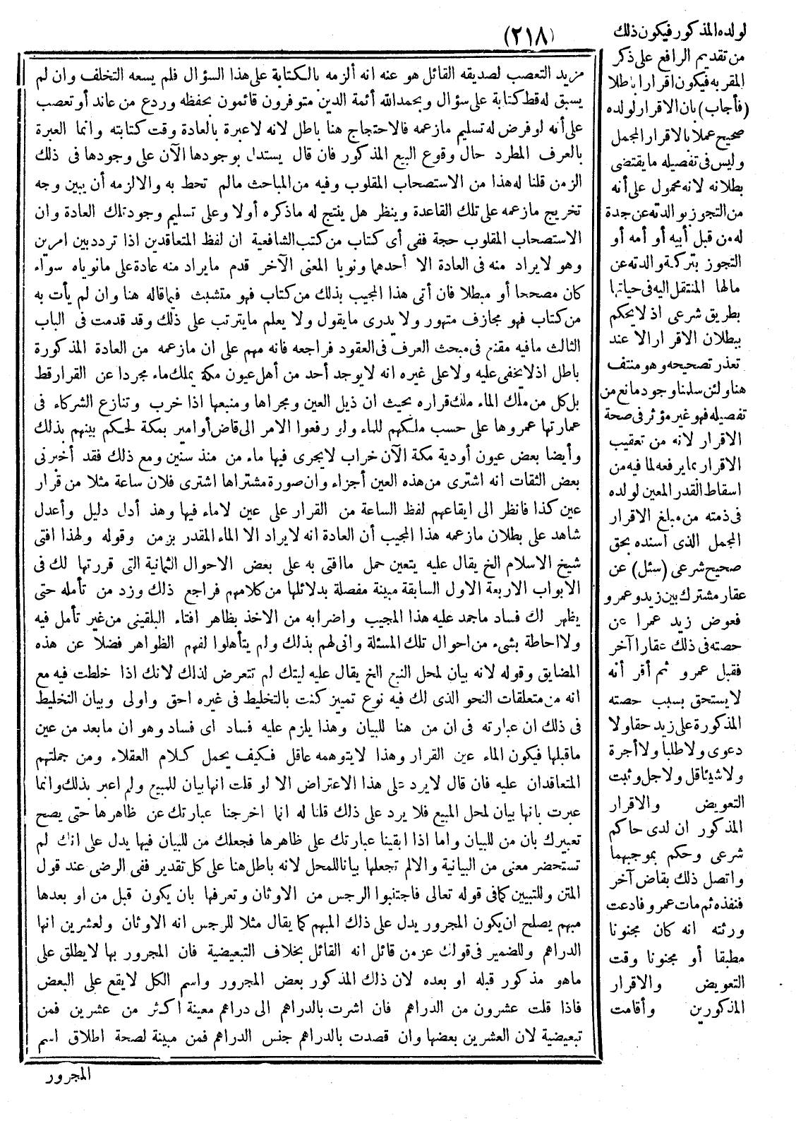 فَإِنْ أَتَى هَذَا الْمُجِيبُ بِذَلِكَ مِنْ كِتَابٍ فَهُوَ مُتَشَبِّثٌ فِيمَا قَالَهُ هُنَا وَإِنْ لَمْ يَأْتِ بِهِ مِنْ كِتَابٍ فَهُوَ مُجَازِفٌ مُتَهَوِّرٌ وَلَا يَدْرِي مَا يَقُولُ وَلَا يَعْلَمُ مَا يَتَرَتَّبُ عَلَى ذَلِكَ وَقَدْ قَدَّمْتُ فِي الْبَابِ الثَّالِثِ مَا فِيهِ مَقْنَعٌ فِي مَبْحَثِ الْعُرْفِ فِي الْعُقُودِ فَرَاجِعْهُ فَإِنَّهُ مُهِمٌّ عَلَى أَنَّ مَا زَعَمَهُ مِنْ الْعَادَةِ الْمَذْكُورَةِ بَاطِلٌ إذْ لَا يَخْفَى عَلَيْهِ وَلَا عَلَى غَيْرِهِ أَنَّهُ لَا يُوجَدُ أَحَدٌ مِنْ أَهْلِ عُيُونِ مَكَّةَ يَمْلِكُ مَاءً مُجَرَّدًا عَنْ الْقَرَارِ قَطُّ بَلْ كُلُّ مَنْ مَلَكَ الْمَاءَ مَلَكَ قَرَارَهُ بِحَيْثُ إنَّ ذَيْلَ الْعَيْنِ وَمَجْرَاهَا وَمَنْبَعَهَا إذَا خَرِبَ وَتَنَازَعَ الشُّرَكَاءُ فِي عِمَارَتِهَا عَمَرُوهَا عَلَى حَسَبِ مِلْكِهِمْ لِلْمَاءِ وَلَوْ رَفَعُوا الْأَمْرَ إلَى قَاضٍ أَوْ أَمِيرٍ بِمَكَّةَ لَحَكَمَ بَيْنَهُمْ بِذَلِكَ وَأَيْضًا بَعْضُ عُيُونِ أَوْدِيَةِ مَكَّةَ الْآنَ خَرَابٌ لَا يَجْرِي فِيهَا مَاءٌ مِنْ مُنْذُ سِنِينَ وَمَعَ ذَلِكَ فَقَدْ أَخْبَرَنِي بَعْضُ الثِّقَاتِ أَنَّهُ اشْتَرَى مِنْ هَذِهِ الْعَيْنِ أَجْزَاءً وَأَنَّ صُورَةَ مُشْتَرَاهَا اشْتَرَى فُلَانٌ سَاعَةً مَثَلًا مِنْ قَرَارِ عَيْنِ كَذَا فَانْظُرْ إلَى إيقَاعِهِمْ لَفْظَ السَّاعَةِ مِنْ الْقَرَارِ عَلَى عَيْنٍ لَا مَاءَ فِيهَا وَهَذَا أَدُلُّ دَلِيلٍ وَأَعْدَلُ شَاهِدٍ عَلَى بُطْلَانِ مَا زَعَمَهُ هَذَا الْمُجِيبُ أَنَّ الْعَادَةَ أَنَّهُ لَا يُرَادُ إلَّا الْمَاءُ الْمُقَدَّرُ بِزَمَنٍ.