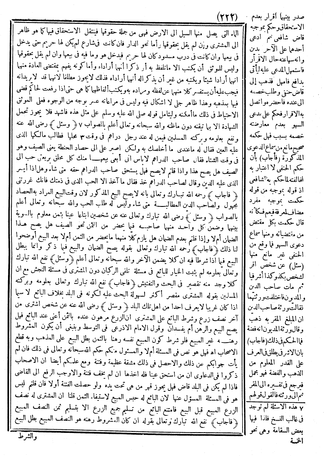 الْمَاءِ الَّتِي يَصِلُ مِنْهَا السَّيْلُ إلَى الْأَرْضِ فَهِيَ مِنْ جُمْلَةِ حُقُوقِهَا فَيَنْتَقِلُ الِاسْتِحْقَاقُ فِيهَا كَمَا هُوَ ظَاهِرٌ إلَى الْمُشْتَرِي وَإِنْ لَمْ يَقُلْ بِحُقُوقِهَا وَأَمَّا نَحْوَ الدَّارِ فَإِنْ كَانَتْ فِي شَارِعٍ لَمْ يَكُنْ لَهَا حَرِيمٌ حَتَّى يَدْخُلَ فِي بَيْعِهَا وَإِنْ كَانَتْ فِي دَرْبٍ مَسْدُودٍ كَانَ لَهَا حَرِيمٌ فَيَدْخُلُ هُوَ وَمَا فِيهِ فِي بَيْعِهَا وَإِنْ لَمْ يَقُلْ بِحُقُوقِهَا وَلَيْسَ لِلْمُوَثِّقِ أَنْ يَكْتُبَ إلَّا مَا تَلَفَّظَا بِهِ أَوْ ذَكَرَا أَنَّهُمَا أَرَادَاهُ وَأَمَّا كَوْنُهُ يُفْهَمُ بِمُقْتَضَى الْعَادَةِ مِنْهُمَا أَنَّهُمَا أَرَادَا شَيْئًا وَيَكْتُبُهُ مِنْ غَيْرِ أَنْ يَذْكُرَا لَهُ أَنَّهُمَا أَرَادَاهُ فَذَلِكَ لَا يَجُوزُ مُطْلَقًا لِأَنَّهُمَا قَدْ لَا يُرِيدَانِهِ فَيَجِبُ عَلَيْهِ أَنْ يَسْتَفْسِرَ كُلًّا مِنْهُمَا عَنْ لَفْظِهِ وَمُرَادِهِ بِهِ وَيَكْتُبَ أَلْفَاظَهُمَا كَمَا هِيَ حَتَّى إذَا رُفِعَتْ لِحَاكِمٍ قَضَى فِيهَا بِمَذْهَبِهِ وَهَذَا ظَاهِرٌ جَلِيٌّ لَا إشْكَالَ فِيهِ.