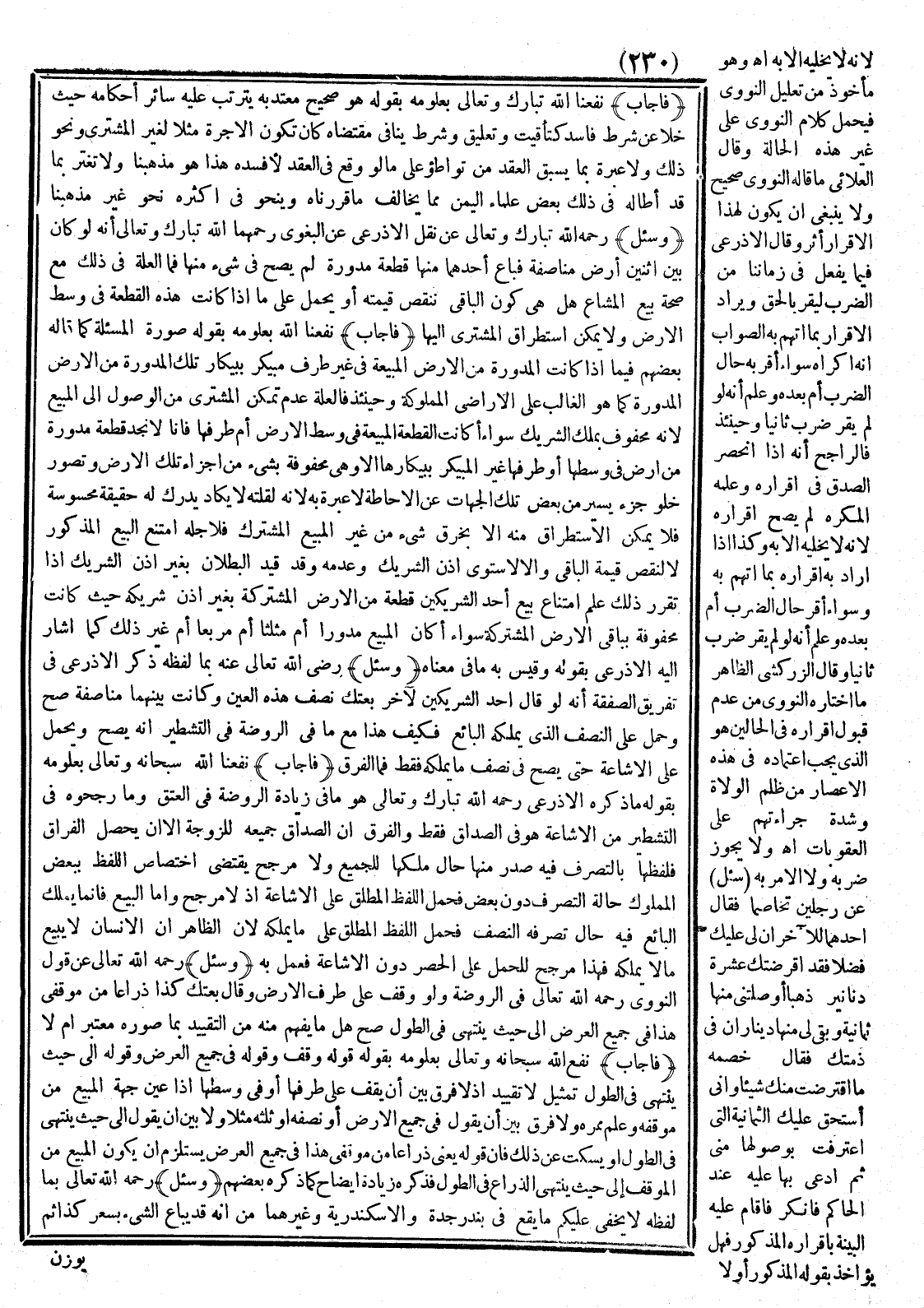 فَإِنَّا لَا نَجِدُ قِطْعَةً مُدَوَّرَةً مِنْ أَرْضٍ فِي وَسَطِهَا أَوْ طَرَفِهَا غَيْرِ الْمُبَيْكَرِ بِبَيْكَارِهَا إلَّا وَهِيَ مَحْفُوفَةٌ بِشَيْءٍ مِنْ أَجْزَاءِ تِلْكَ الْأَرْضِ وَتَصَوُّرُ خُلُوِّ جُزْءٍ يَسِيرٍ مِنْ بَعْضِ تِلْكَ الْجِهَاتِ عَنْ الْإِحَاطَةِ لَا عِبْرَةَ بِهِ لِأَنَّهُ لِقِلَّتِهِ لَا يَكَادُ يُدْرَكُ لَهُ حَقِيقَةٌ مَحْسُوسَةٌ فَلَا يُمْكِنُ الِاسْتِطْرَاقُ مِنْهُ إلَّا بِخَرْقِ شَيْءٍ مِنْ غَيْرِ الْمَبِيعِ الْمُشْتَرَكِ فَلِأَجْلِهِ امْتَنَعَ الْبَيْعُ الْمَذْكُورُ لَا لِنَقْصِ قِيمَةِ الْبَاقِي وَإِلَّا لَاسْتَوَى إذْنُ الشَّرِيكِ وَعَدَمِهِ وَقَدْ قُيِّدَ الْبُطْلَانُ بِغَيْرِ إذْنِ الشَّرِيكِ إذَا تَقَرَّرَ ذَلِكَ عُلِمَ امْتِنَاعُ بَيْعِ أَحَدِ الشَّرِيكَيْنِ قِطْعَةً مِنْ الْأَرْضِ الْمُشْتَرَكَةِ بِغَيْرِ إذْنِ شَرِيكِهِ حَيْثُ كَانَتْ مَحْفُوفَةً بِبَاقِي الْأَرْضِ الْمُشْتَرَكَةِ سَوَاءٌ أَكَانَ الْمَبِيعُ مُدَوَّرًا أَمْ مُثَلَّثًا أَمْ مُرَبَّعًا أَمْ غَيْرَ ذَلِكَ كَمَا أَشَارَ إلَيْهِ الْأَذْرَعِيُّ بِقَوْلِهِ وَقِيسَ بِهِ مَا فِي مَعْنَاهُ.