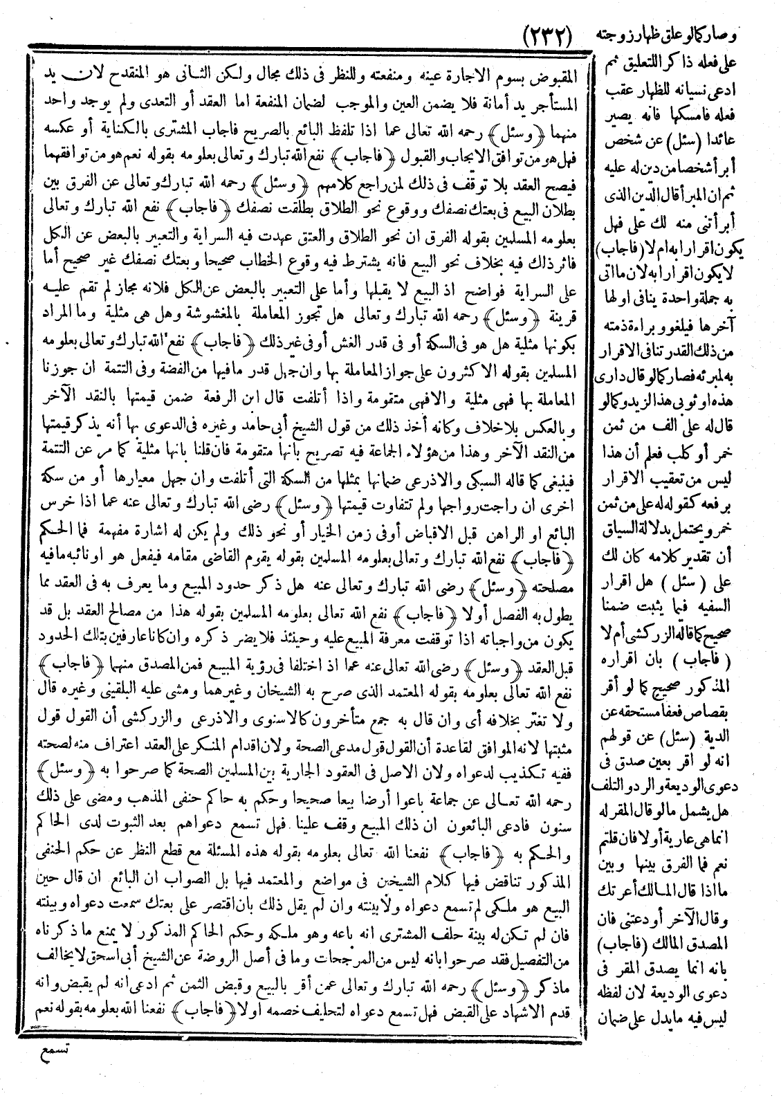 (فَأَجَابَ) نَفَعَنَا اللَّهُ تَعَالَى بِعُلُومِهِ بِقَوْلِهِ هَذِهِ الْمَسْأَلَةُ مَعَ قَطْعِ النَّظَرِ عَنْ حُكْمِ الْحَنَفِيِّ الْمَذْكُورِ تَنَاقَضَ فِيهَا كَلَامُ الشَّيْخَيْنِ فِي مَوَاضِعَ وَالْمُعْتَمَدُ فِيهَا بَلْ الصَّوَابُ أَنَّ الْبَائِعَ إنْ قَالَ حِينَ الْبَيْعِ هُوَ مِلْكِي لَمْ تُسْمَعْ دَعْوَاهُ وَلَا بَيِّنَتُهُ وَإِنْ لَمْ يَقُلْ ذَلِكَ بِأَنْ اقْتَصَرَ عَلَى بِعْتُكَ سُمِعَتْ دَعْوَاهُ وَبَيِّنَتُهُ فَإِنْ لَمْ تَكُنْ لَهُ بَيِّنَةٌ حَلَفَ الْمُشْتَرِي أَنَّهُ بَاعَهُ وَهُوَ مِلْكُهُ وَحُكْمُ الْحَاكِمِ الْمَذْكُورِ لَا يَمْنَعُ مَا ذَكَرْنَاهُ مِنْ التَّفْصِيلِ فَقَدْ صَرَّحُوا بِأَنَّهُ لَيْسَ مِنْ الْمُرَجَّحَات وَمَا فِي أَصْل الرَّوْضَةِ عَنْ الشَّيْخِ أَبِي إِسْحَاقَ لَا يُخَالِفُ مَا ذُكِرَ.