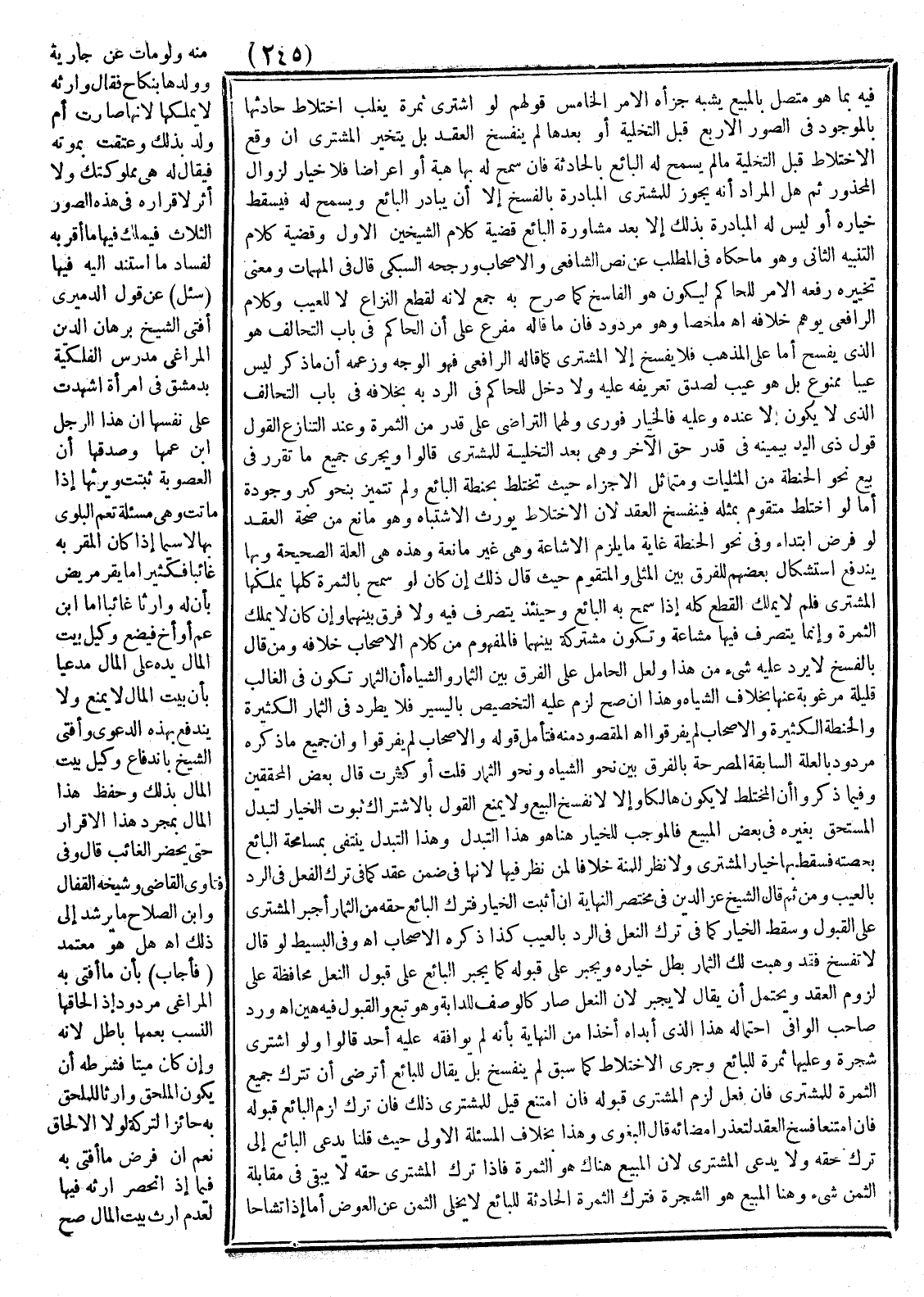 وَهَذَا إنْ صَحَّ لَزِمَ عَلَيْهِ التَّخْصِيصُ بِالْيَسِيرِ فَلَا يَطَّرِدُ فِي الثِّمَارِ الْكَثِيرَةِ وَالْحِنْطَةِ الْكَثِيرَةِ وَالْأَصْحَابُ لَمْ يُفَرَّقُوا اهـ الْمَقْصُودَ مِنْهُ، فَتَأَمَّلْ قَوْلَهُ وَالْأَصْحَابُ لَمْ يُفَرَّقُوا وَأَنَّ جَمِيعَ مَا ذَكَرَهُ مَرْدُودٌ بِالْعِلَّةِ السَّابِقَةِ الْمُصَرِّحَةِ بِالْفَرْقِ بَيْنَ نَحْوِ الشِّيَاهِ وَنَحْوِ الثِّمَارِ قَلَّتْ أَوْ كَثُرَتْ قَالَ بَعْضُ الْمُحَقِّقِينَ وَفِيمَا ذَكَرُوا أَنَّ الْمُخْتَلَطَ لَا يَكُونُ هَالِكًا وَإِلَّا لَانْفَسَخَ الْبَيْعُ وَلَا يَمْنَعُ الْقَوْلُ بِالِاشْتِرَاكِ ثُبُوتَ الْخِيَارِ لِتَبَدُّلِ الْمُسْتَحَقِّ بِغَيْرِهِ فِي بَعْضِ الْمَبِيعِ. فَالْمُوجِبُ لِلْخِيَارِ هُنَا هُوَ هَذَا التَّبَدُّلُ، وَهَذَا التَّبَدُّلُ يَنْتَفِي بِمُسَامَحَةِ الْبَائِعِ بِحِصَّتِهِ فَسَقَطَ بِهَا خِيَارُ الْمُشْتَرِي وَلَا نَظَرَ لِلْمِنَّةِ خِلَافًا لِمَنْ نَظَرَ فِيهَا لِأَنَّهَا فِي ضِمْنِ عَقْدٍ كَمَا فِي تَرْكِ الْفِعْلِ فِي الرَّدِّ بِالْعَيْبِ وَمِنْ ثَمَّ قَالَ الشَّيْخُ عِزُّ الدِّينِ فِي مُخْتَصَرِ النِّهَايَةِ: إنْ أَثْبَتَ الْخِيَارَ فَتَرَكَ الْبَائِعُ حَقَّهُ مِنْ الثِّمَارِ أُجْبِرَ الْمُشْتَرِي عَلَى الْقَبُولِ وَسَقَطَ الْخِيَارُ كَمَا فِي تَرْكِ النَّعْلِ فِي الرَّدِّ بِالْعَيْبِ كَذَا ذَكَرَهُ الْأَصْحَابُ اهـ.