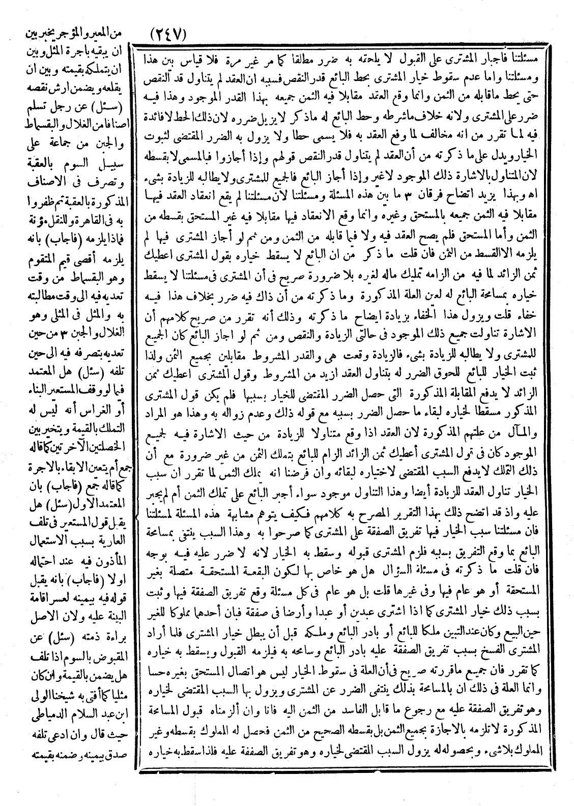وَإِنْ فَرَضْنَا أَنَّهُ يَمْلِكُ الثَّمَنَ لِمَا تَقَرَّرَ أَنَّ سَبَبَ الْخِيَارِ تَنَاوُلُ الْعَقْدِ لِلزِّيَادَةِ أَيْضًا وَهَذَا التَّنَاوُلُ مَوْجُودٌ سَوَاءٌ أُجْبِرَ الْبَائِعُ عَلَى تَمَلُّكِ الثَّمَنِ أَمْ لَمْ يُجْبَرْ عَلَيْهِ وَإِذْ قَدْ اتَّضَحَ ذَلِكَ بِهَذَا التَّقْرِيرِ الْمُصَرِّحِ بِهِ كَلَامُهُمْ فَكَيْف يُتَوَهَّمُ مُشَابَهَةُ هَذِهِ الْمَسْأَلَةِ لِمَسْأَلَتِنَا فَإِنَّ مَسْأَلَتَنَا سَبَبُ الْخِيَارِ فِيهَا تَفْرِيقُ الصَّفْقَةِ عَلَى الْمُشْتَرِي كَمَا صَرَّحُوا بِهِ. وَهَذَا السَّبَبُ يَنْتَفِي بِمُسَامَحَةِ الْبَائِعِ بِمَا وَقَعَ التَّفْرِيقُ بِسَبَبِهِ فَلَزِمَ الْمُشْتَرِيَ قَبُولُهُ وَسَقَطَ بِهِ الْخِيَارُ لِأَنَّهُ لَا ضَرَرَ عَلَيْهِ فِيهِ بِوَجْهٍ فَإِنْ قُلْت: مَا ذَكَرْتُهُ فِي مَسْأَلَةِ السُّؤَالِ هَلْ هُوَ خَاصٌّ بِهَا لِكَوْنِ الْبُقْعَةِ الْمُسْتَحَقَّةِ مُتَّصِلَةً بِغَيْرِ الْمُسْتَحَقَّةِ أَوْ هُوَ عَامٌّ فِيهَا وَفِي غَيْرِهَا.