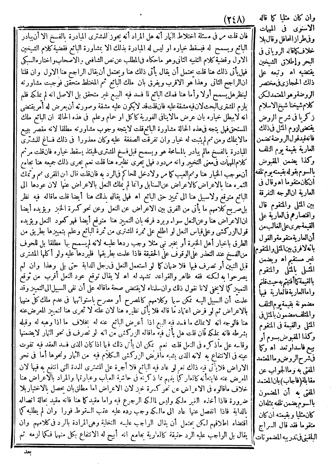فَإِنْ قُلْت: مَرَّ فِي مَسْأَلَةِ اخْتِلَاطِ الثِّمَارِ أَنَّهُ هَلْ الْمُرَادُ أَنَّهُ يَجُوزُ لِلْمُشْتَرِي الْمُبَادَرَةُ بِالْفَسْخِ إلَّا أَنْ يُبَادِرَ الْبَائِعُ وَيَسْمَحُ لَهُ فَيَسْقُطُ خِيَارُهُ أَوْ لَيْسَ لَهُ الْمُبَادَرَةُ بِذَلِكَ إلَّا بِمُشَاوِرَةِ الْبَائِعِ، فَقَضِيَّةُ كَلَامِ الشَّيْخَيْنِ الْأَوَّلُ وَقَضِيَّةُ كَلَامِ التَّنْبِيهِ الثَّانِي وَهُوَ مَا حَكَاهُ فِي الْمَطْلَبِ عَنْ نَصِّ الشَّافِعِيِّ وَالْأَصْحَابِ وَاخْتَارَهُ السُّبْكِيّ فَهَلْ يَأْتِي ذَلِكَ هُنَا قُلْت: يُحْتَمَلُ أَنْ يُقَالَ يَأْتِي ذَلِكَ هُنَا وَيُحْتَمَلُ أَنْ يُقَالَ الرَّاجِحُ هُنَا الْأَوَّلُ.