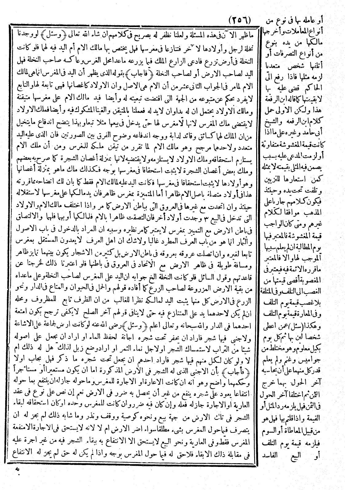 (فَأَجَابَ) بِأَنَّ الْأَجْنَبِيَّ الَّذِي لَهُ الشَّجَرُ فِي الْأَرْضِ الْمَذْكُورَةِ إمَّا أَنْ يَكُونَ مُسْتَعِيرًا أَوْ مُسْتَأْجِرًا وَحُكْمُهُمَا وَاضِحٌ وَهُوَ أَنَّهُ إنْ كَانَتْ الْإِعَارَةُ أَوْ الْإِجَارَةُ لِلْمَغْرِسِ وَمَا حَوْلَهُ جَازَ لَهُ أَنْ يَنْتَفِعَ بِمَا حَوْلَهُ انْتِفَاعًا يَعُودُ عَلَى شَجَرِهِ بِنَفْعٍ مِنْ غَيْرِ أَنْ يَحْصُلَ بِهِ ضَرَرٌ فِي الْأَرْضِ نَعَمْ إنْ نَصَّ عَلَى نَوْعٍ فِي عَقْدِ الْعَارِيَّةِ أَوْ الْإِجَارَةِ جَازَ لَهُ فِعْلُهُ وَإِنْ كَانَ فِيهِ ضَرَرٌ وَإِنْ كَانَتْ لِلْمَغْرِسِ وَحْدَهُ أَوْ كَانَ اسْتِحْقَاقُهُ لِبَقَاءِ الشَّجَرِ فِي تِلْكَ الْأَرْضِ مِنْ جِهَةِ بَيْعٍ وَنَحْوِهِ كَوَصِيَّةٍ وَوَقْفٍ وَنَذْرٍ وَمَا شَابَهَ ذَلِكَ لَمْ يَجُزْ لَهُ أَنْ يَتَصَرَّفَ فِيمَا حَوْلَ الْمَغْرِسِ بِشَيْءٍ مُطْلَقًا سَوَاءٌ أَضَرَّ الْأَرْضَ أَمْ لَا لِأَنَّهُ لَا يَسْتَحِقُّ فِي الْإِجَارَةِ إلَّا مَنْفَعَةَ الْمَغْرِسِ فَقَطْ وَفِي الْعَارِيَّةِ وَنَحْوِ الْبَيْعِ لَا يَسْتَحِقُّ إلَّا الِانْتِفَاعَ بِهِ بِبَقَاءِ الشَّجَرِ فِيهِ مِنْ غَيْرِ أُجْرَةٍ عَلَيْهِ فِي مُقَابَلَةِ ذَلِكَ الْإِبْقَاءِ فَلَا حَقَّ لَهُ حَوْلَ الْمَغْرِسِ بِوَجْهٍ.