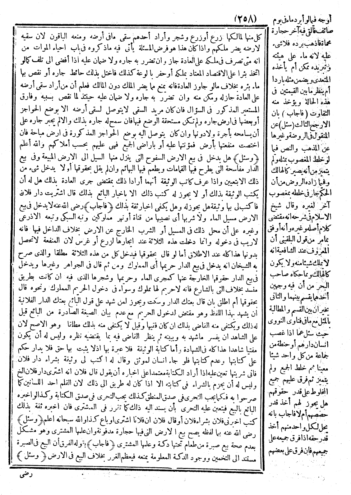 كُلّ مِنْهَا لِمَالِكِهَا زَرْعٌ أَوْ زَرْعٌ وَشَجَرٌ وَأَرَادَ أَحَدُهُمْ سَقْيَ مَا فِي أَرْضِهِ وَمَنَعَهُ الْبَاقُونَ لِأَنَّ سَقْيَهُ لِأَرْضِهِ يَضُرُّ مِلْكَهُمْ وَإِذَا كَانَ هَذَا هُوَ فَرْضُ الْمَسْأَلَةِ يَأْتِي فِيهِ مَا ذَكَرُوهُ فِي بَابِ إحْيَاءِ الْمَوَاتِ مِنْ أَنَّهُ مَتَى تَصَرَّفَ فِي مِلْكِهِ عَلَى الْعَادَةِ جَازَ وَإِنْ تَضَرَّرَ بِهِ جَارُهُ وَلَا ضَمَانَ عَلَيْهِ إذَا أَفْضَى إلَى تَلَفٍ كَمَا لَوْ اتَّخَذَ بِئْرًا عَلَى الِاقْتِصَادِ الْمُعْتَادِ بِمِلْكِهِ أَوْ حَفَرَ بَالُوعَةً كَذَلِكَ فَاخْتَلَّ بِذَلِكَ حَائِطُ جَارِهِ أَوْ نَقَصَ بِهَا مَاءُ بِئْرِهِ بِخِلَافِ مَا لَوْ جَاوَزَ الْعَادَةَ فَإِنَّهُ يُمْنَعُ مِمَّا يَضُرُّ الْمِلْكَ دُونَ الْمَالِكِ فَعُلِمَ أَنَّ مَنْ أَرَادَ سَقْيَ أَرْضِهِ عَلَى الْعَادَةِ جَازَ لَهُ وَمُكِّنَ مِنْهُ وَإِنْ تَضَرَّرَ بِهِ جَارُهُ وَلَا ضَمَانَ عَلَيْهِ حِينَئِذٍ لِمَا نَقَصَ بِسَبَبِهِ وَفَارَقَ الْمُسْتَعِير الْمَذْكُور فِي السُّؤَالِ.