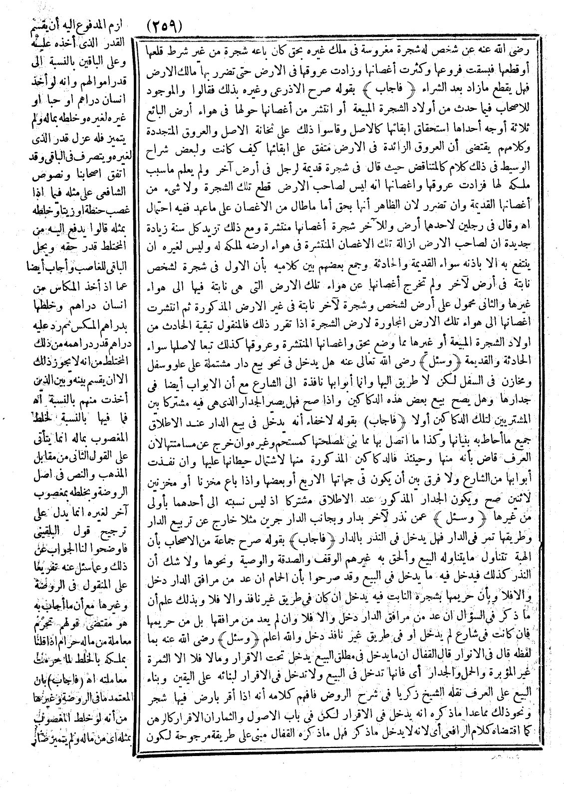 وَقَالَ فِي رَجُلَيْنِ لِأَحَدِهِمَا أَرْضٌ وَلِلْآخَرِ شَجَرَةٌ أَغْصَانُهَا مُنْتَشِرَةٌ وَمَعَ ذَلِكَ تَزِيدُ كُلَّ سَنَةٍ زِيَادَةً جَدِيدَةً أَنَّ لِصَاحِبِ الْأَرْضِ إزَالَةَ تِلْكَ الْأَغْصَانِ الْمُنْتَشِرَةِ فِي هَوَاءِ أَرْضِهِ لِمِلْكِهِ لَهُ وَلَيْسَ لِغَيْرِهِ أَنْ يَنْتَفِعَ بِهِ إلَّا بِإِذْنِهِ سَوَاءٌ الْقَدِيمَة وَالْحَادِثَة وَجَمَعَ بَعْضُهُمْ بَيْنَ كَلَامَيْهِ بِأَنَّ الْأَوَّلَ فِي شَجَرَةٍ لِشَخْصٍ نَابِتَةٍ فِي أَرْضٍ لِآخَرَ وَلَمْ تَخْرُجْ أَغْصَانُهَا عَنْ هَوَاءِ تِلْكَ الْأَرْضِ الَّتِي هِيَ نَابِتَةٌ فِيهَا إلَى هَوَاءِ غَيْرِهَا وَالثَّانِي مَحْمُولٌ عَلَى أَرْضٍ لِشَخْصٍ وَشَجَرَةٍ لِآخَرَ نَابِتَةٍ فِي غَيْرِ الْأَرْضِ الْمَذْكُورَةِ ثُمَّ انْتَشَرَتْ أَغْصَانُهَا إلَى هَوَاءِ تِلْكَ الْأَرْضِ الْمُجَاوِرَةِ لِأَرْضِ الشَّجَرَةِ إذَا تَقَرَّرَ ذَلِكَ فَالْمَنْقُولُ تَبْقِيَةُ الْحَادِثِ مِنْ أَوْلَادِ الشَّجَرَةِ الْمَبِيعَةِ أَوْ غَيْرِهَا مِمَّا وُضِعَ بِحَقٍّ وَأَغْصَانُهَا الْمُنْتَشِرَةُ وَعُرُوقُهَا كَذَلِكَ تَبَعًا لِأَصْلِهَا سَوَاءٌ الْحَادِثَة وَالْقَدِيمَة.