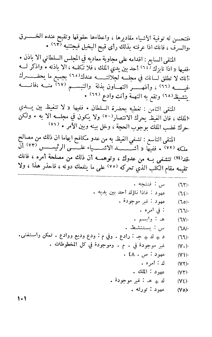 المتقي الثَّامِن تَغْطِيَة بِحَضْرَة السُّلْطَان فَفِيهَا لَا تتغيظ بَين يَدي الْملك فَإِن الغيظ يُحَرك الِانْتِصَار وَلَا يكون فِي مَجْلِسه إِلَّا بِهِ وَلَكِن حرك غضب الْملك بِوُجُوب الْحجَّة وخل بَينه وَبَين الْأَمر