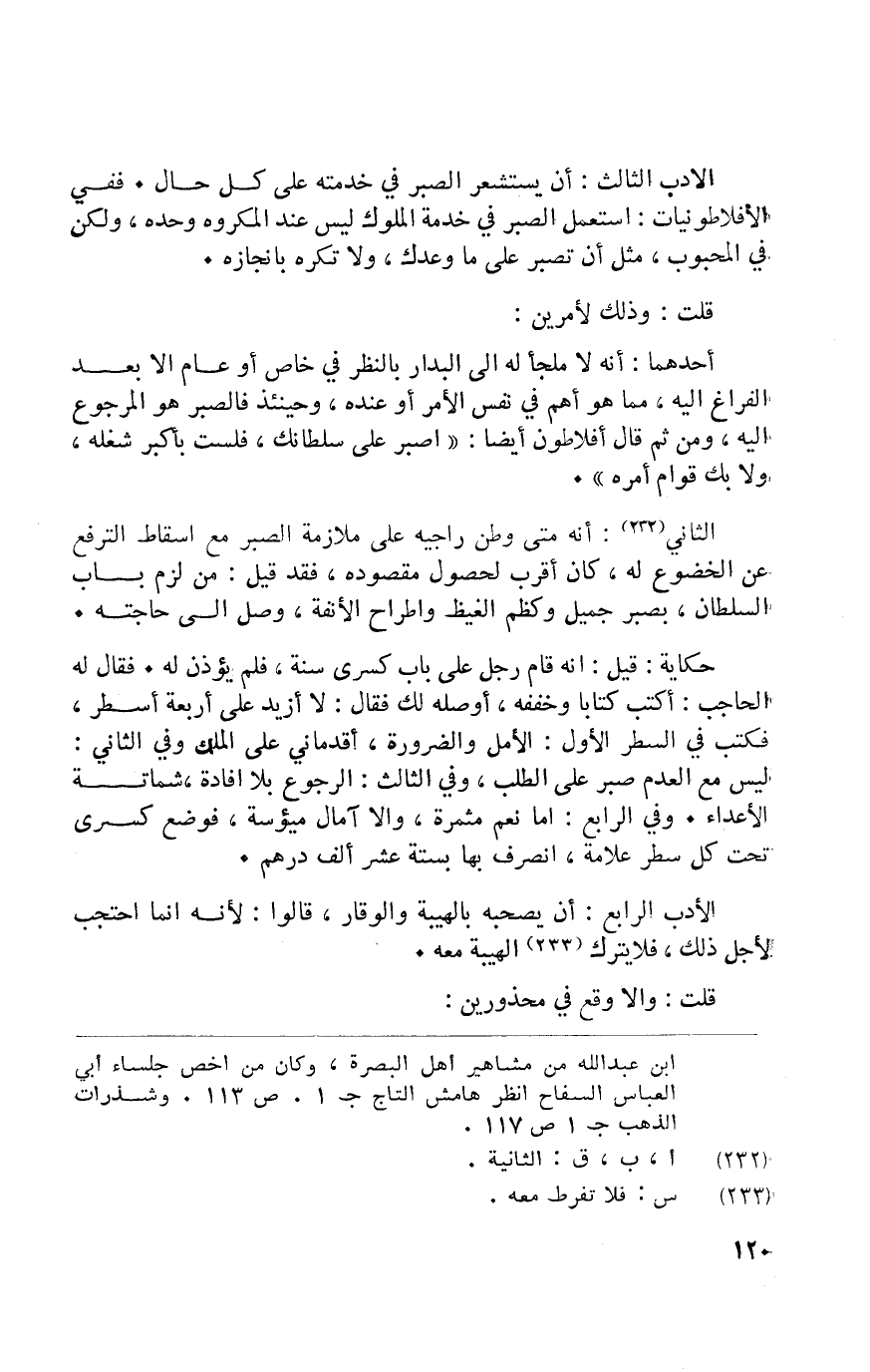 الْأَدَب الثَّالِث أَن يستشعر الصَّبْر فِي خدمته على كل حَال فَفِي الأفلاطونيات اسْتعْمل الصَّبْر فِي خدمَة الْمُلُوك لَيْسَ عِنْد الْمَكْرُوه وَحده وَلَكِن فِي المحبوب مثل أَن تصبر على مَا وَعدك وَلَا تكره بإنجازه