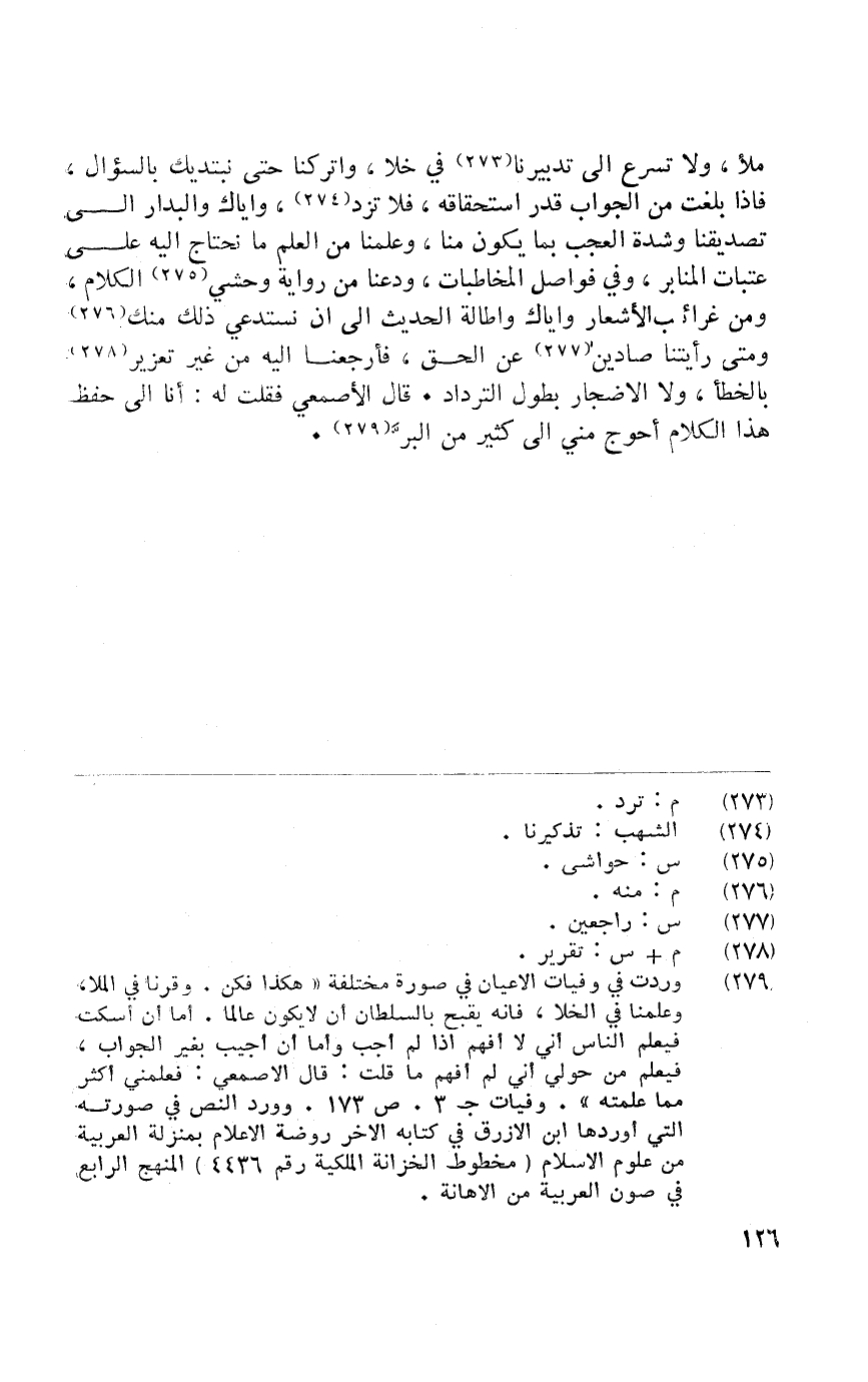 مَلأ وَلَا تسرع إِلَى تدبيرنا فِي خلا واتركنا حَتَّى نبتديك بالسؤال فَإِذا بلغت من الْجَواب قدر اسْتِحْقَاقه فَلَا تزد وَإِيَّاك والبدار إِلَى تصديقنا وَشدَّة الْعجب بِمَا يكون منا وَعلمنَا من الْعلم مَا نحتاج إِلَيْهِ على عتبات المنابر وَفِي فواصل المخاطبات وَدعنَا من رِوَايَة وَحشِي الْكَلَام وَمن غرائب الْأَشْعَار وَإِيَّاك وإطالة الحَدِيث إِلَى أَن نستدعي ذَلِك مِنْك وَمَتى رايتنا صادين عَن الْحق فأرجعنا غليه من غير تَعْزِير بالْخَطَأ وَلَا الإضجار بطول الترداد قَالَ الْأَصْمَعِي فَقلت لَهُ أَنا إِلَى حفظ هَذَا الْكَلَام أحْوج مني إِلَى كثير من الْبر