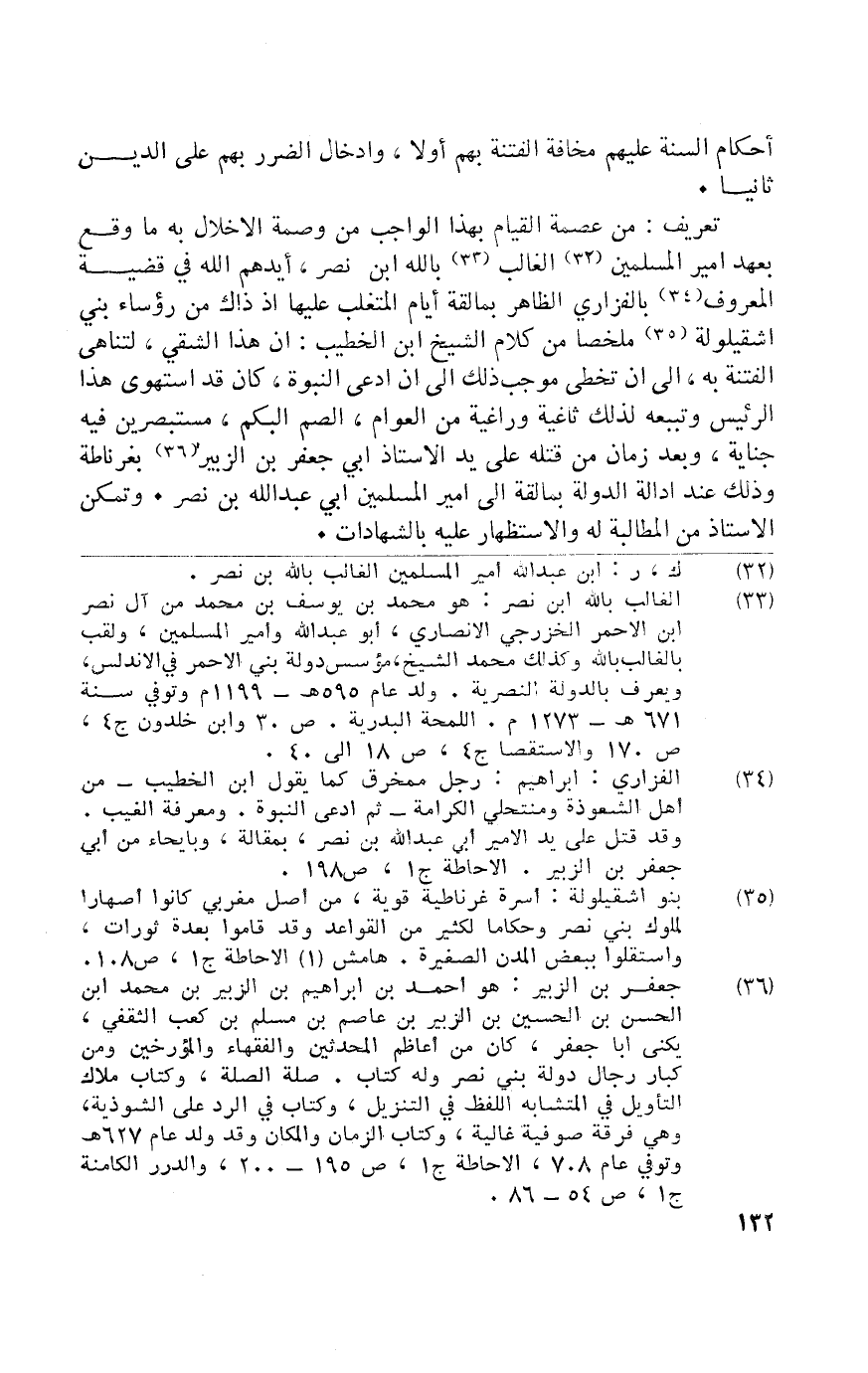 تَعْرِيف من عصمَة الْقيام بِهَذَا الْوَاجِب من وصمة الْإِخْلَال بِهِ مَا وَقع بِعَهْد أَمِير الْمُسلمين الْغَالِب بِاللَّه ابْن نصر أَيّدهُم الله فِي قَضِيَّة الْمَعْرُوف بالفزاري الظَّاهِر بمالقة أَيَّام المتغلب عَلَيْهَا إِذْ ذَاك من رُؤَسَاء بني إشقيلولة مُلَخصا من كَلَام الشَّيْخ ابْن الْخَطِيب أَن هَذَا الشقي لتناهي الْفِتْنَة بِهِ إِلَى أَن تخطى مُوجب ذَلِك إِلَى أَن ادّعى النُّبُوَّة كَانَ قد استهوى هَذَا الرئيس وتببعه لذَلِك ثاغية وراغية من الْعَوام الصم الْبكم مستبصرين فِيهِ جِنَايَة وَبعد زمَان من قَتله على يَد الْأُسْتَاذ أبي جَعْفَر بن الزبير بغرناطة وَذَلِكَ عِنْد إدالة الدولة بمالقة إِلَى أَمِير الْمُسلمين أبي عبد الله بن نصر وَتمكن الْأُسْتَاذ من الْمُطَالبَة لَهُ والاستظهار عَلَيْهِ بالشهادات