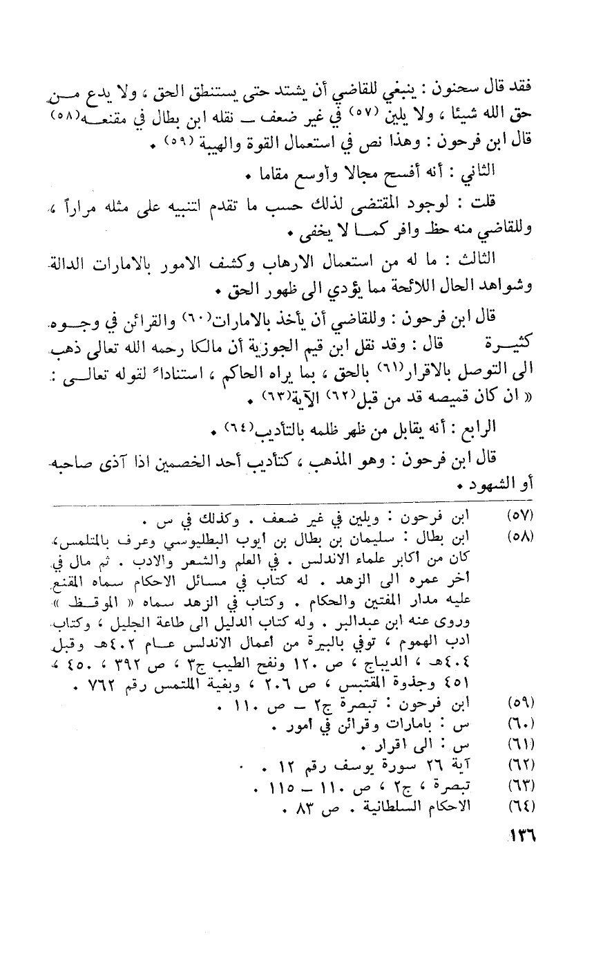 فقد قَالَ سَحْنُون يَنْبَغِي للْقَاضِي أَن يشْتَد حَتَّى يستنطق الْحق وَلَا يدع من حق الله شَيْئا وَلَا يلين فِي غير ضعف نَقله ابْن بطال فِي مقنعه قَالَ ابْن فَرِحُونَ وَهَذَا نَص فِي اسْتِعْمَال الْقُوَّة والهيبة