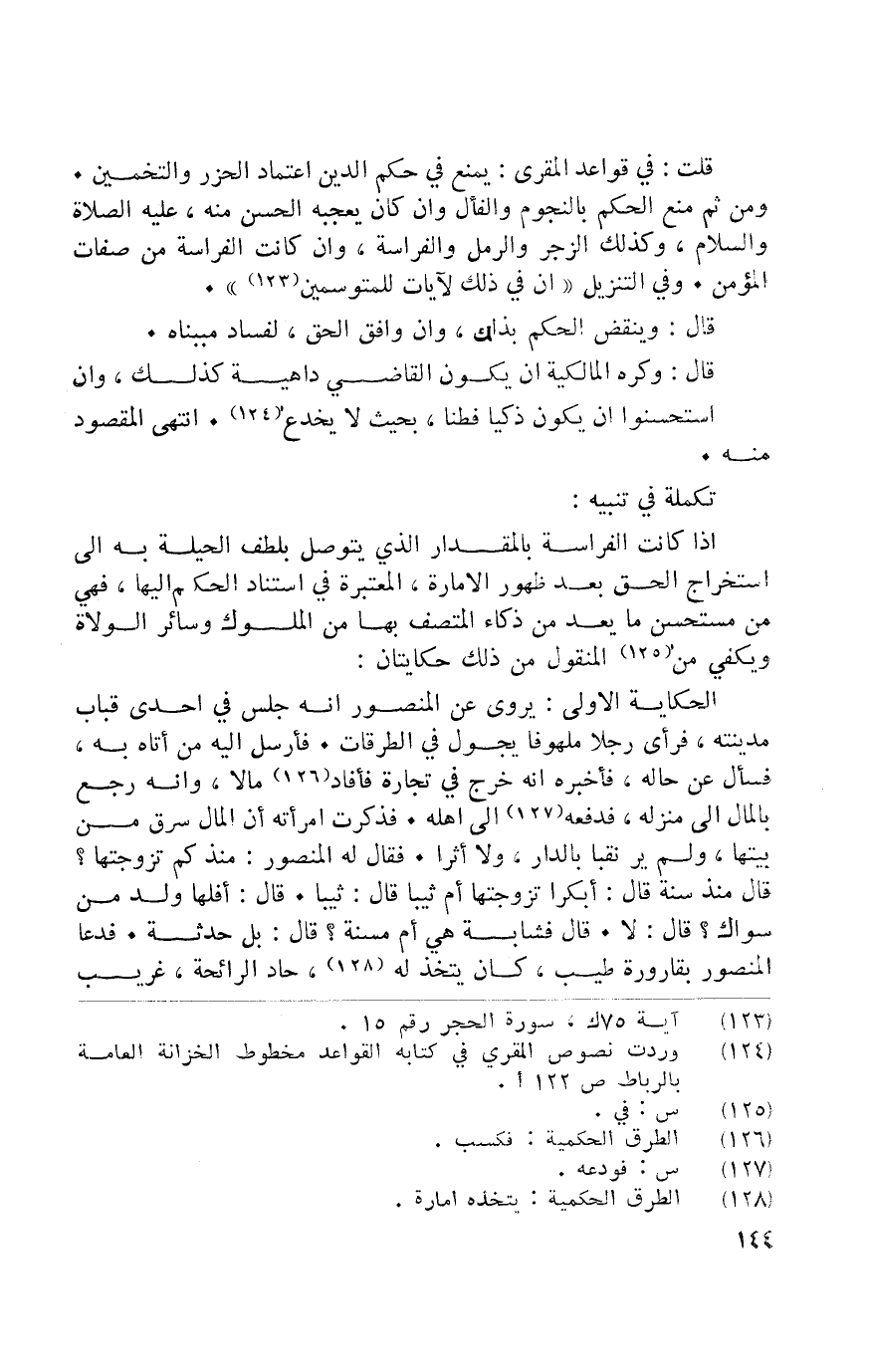 إِذا كَانَت الفراسة بالمقدار الَّذِي يتَوَصَّل بلطف الْحِيلَة بِهِ إِلَى اسْتِخْرَاج الْحق بعد ظُهُور الْإِمَارَة الْمُعْتَبرَة فِي استناد الحكم إِلَيْهَا فَهِيَ من مستحسن مَا يعد من ذكاء المتصف بهَا من الْمُلُوك وَسَائِر الْوُلَاة وَيَكْفِي من الْمَنْقُول من ذَلِك حكايتان