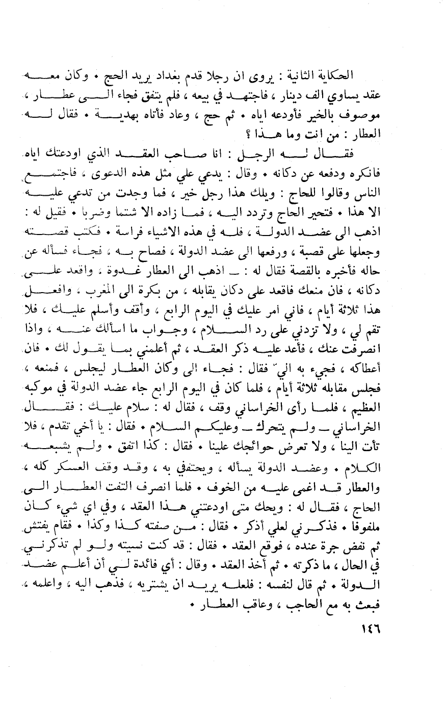 الْحِكَايَة الثَّانِيَة يرْوى أَن رجلا قدم بَغْدَاد يُرِيد الْحَج وَكَانَ مَعَه عقد يُسَاوِي ألف دِينَار فاجتهد فِي بَيْعه فَلم يتَّفق فجَاء إِلَى عطار مَوْصُوف بِالْخَيرِ فأودعه إِيَّاه ثمَّ حج وَعَاد فَأَتَاهُ بهدية فَقَالَ لَهُ الْعَطَّار من أَنْت وَمَا هَذَا