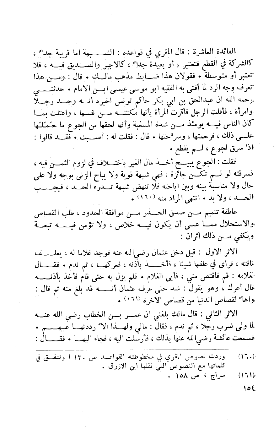 الْفَائِدَة الْعَاشِرَة قَالَ الْمقري فِي قَوَاعِده الشُّبْهَة إِمَّا قريبَة جدا كالشركة فِي الْقطع فَتعْتَبر أَو بعيدَة جدا كالأجير والصدق فِيهِ فَلَا تعْتَبر أَو متوسطة فَقَوْلَانِ هَذَا ضَابِط مَذْهَب مَالك قَالَ وَمن هَذَا تعرف وَجه الرَّد لما أفتى بِهِ الْفَقِيه أَبُو مُوسَى عِيسَى ابْن الإِمَام حَدثنِي رَحمَه الله أَن عبد الْحق بن أبي بكر حَاكم تونس أخبرهُ أَنه وجد رجلا وَامْرَأَة فَأَفلَت الرجل فأقرت الْمَرْأَة بِأَنَّهَا مكنته من نَفسهَا واعتلت بِمَا كَانَ النَّاس فِيهِ يَوْمئِذٍ من شدَّة المسغبة وَأَنَّهَا لحقها من الْجُوع مَا حملهَا على ذَلِك فرحمتها وسرحتها قَالَ فَقلت لَهُ أصبت فقد قَالُوا إِذا سرق لجوع لم يقطع