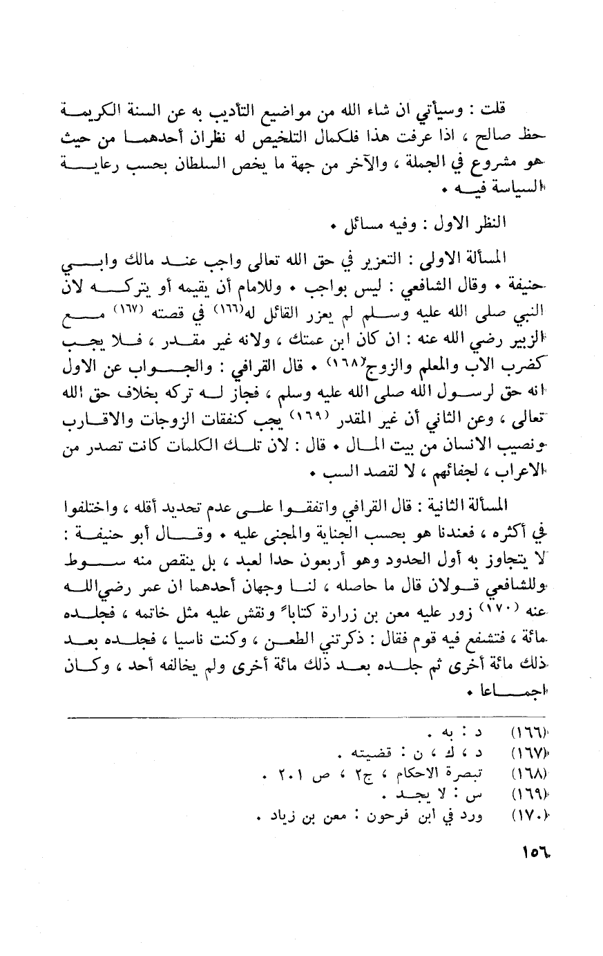 الْمَسْأَلَة الأولى التَّعْزِير فِي حق الله تَعَالَى وَاجِب عِنْد مَالك وَأبي حنيفَة وَقَالَ الشَّافِعِي لَيْسَ بِوَاجِب وَللْإِمَام أَن يقيمه أَو يتْركهُ لِأَن النَّبِي صلى الله عَلَيْهِ وَسلم لم يُعَزّر الْقَائِل لَهُ فِي قصَّته مَعَ الزبير رَضِي الله عَنهُ إِن كَانَ ابْن عَمَّتك وَلِأَنَّهُ غير مُقَدّر فَلَا يجب كضرب الْأَب والمعلم وَالزَّوْج قَالَ الْقَرَافِيّ وَالْجَوَاب عَن الأول أَنه حق لرَسُول الله صلى الله عَلَيْهِ وَسلم فَجَاز لَهُ تَركه بِخِلَاف حق الله تَعَالَى وَعَن الثَّانِي أَن غير الْمُقدر يجب كنفقات الزَّوْجَات والإقارب وَنصِيب الْإِنْسَان من بَيت المَال قَالَ لِأَن تِلْكَ الْكَلِمَات كَانَت تصدر من الْأَعْرَاب لجفائهم لَا لقصد السب