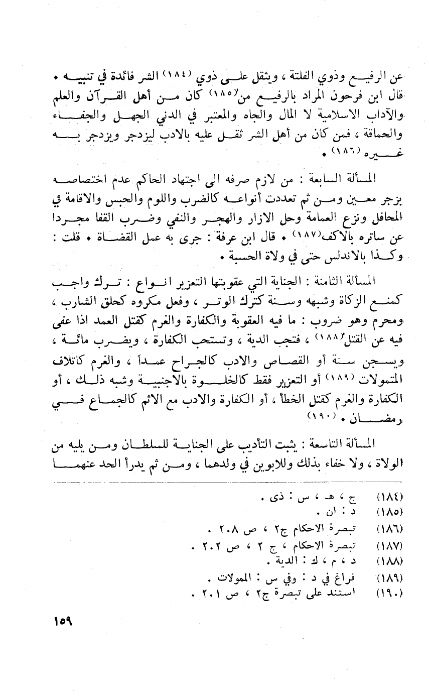 الْمَسْأَلَة الثَّامِنَة الْجِنَايَة الَّتِي عقوبتها التَّعْزِير أَنْوَاع ترك وَاجِب كمنع الزَّكَاة وَشبهه وَسنة كَتَرْكِ الْوتر وَفعل مَكْرُوه كحلق الشَّارِب ومحرم وَهُوَ ضروب مَا فِيهِ الْعقُوبَة وَالْكَفَّارَة وَالْغُرْم كَقَتل الْعمد إِذا عفى فِيهِ عَن الْقَتْل فَتجب الدِّيَة وتستحب الْكَفَّارَة وَيضْرب مائَة ويسجن سنة أَو الْقصاص وَالْأَدب كالجراح عمدا وَالْغُرْم كإتلاف المتمولات أَو التَّعْزِير فَقَط كالخلوة بالأجنبية وَشبه ذَلِك أَو الْكَفَّارَة وَالْغُرْم كَقَتل الْخَطَأ أَو الْكَفَّارَة وَالْأَدب مَعَ الْإِثْم كالجماع فِي رَمَضَان