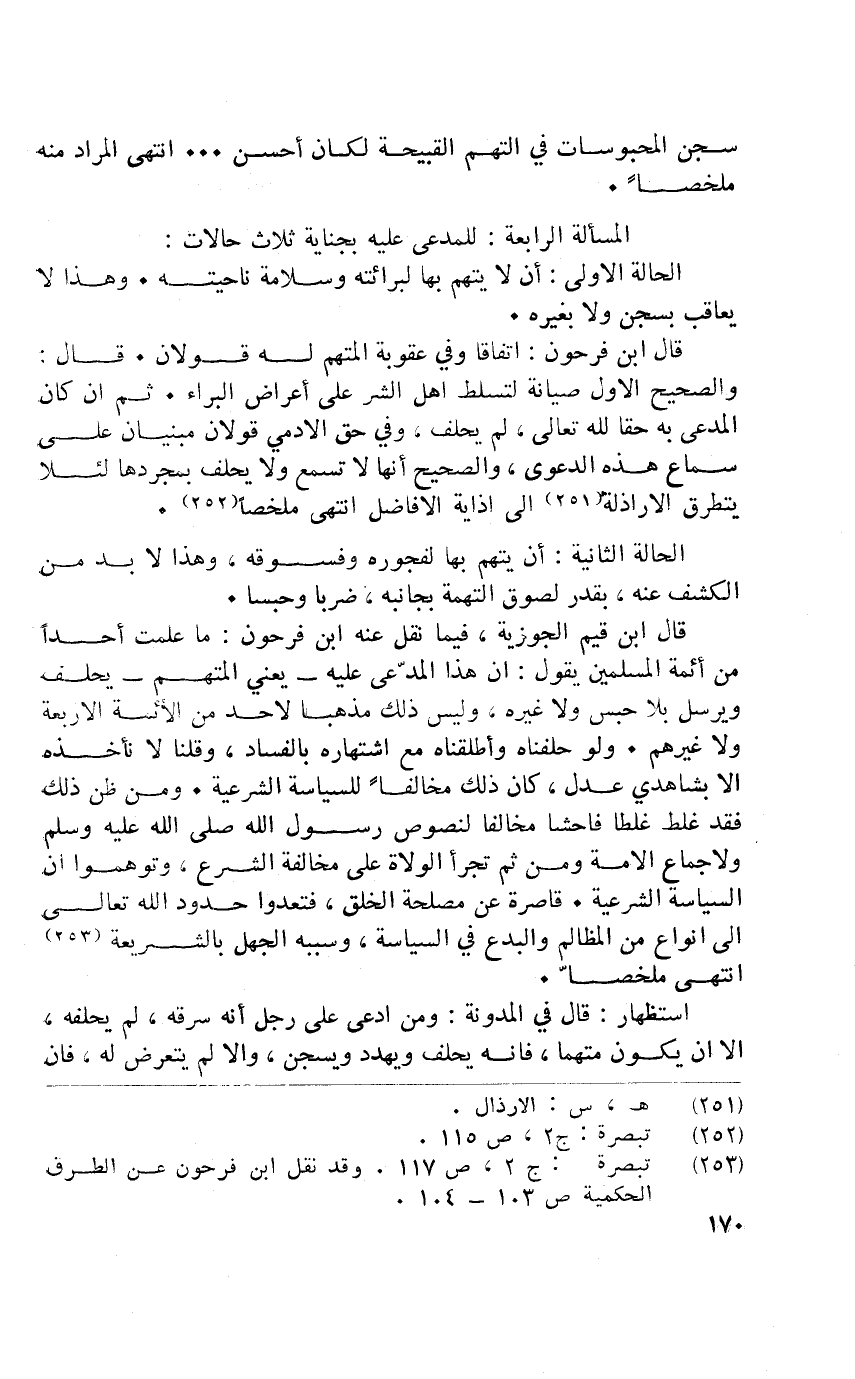 قَالَ ابْن قيم الجوزية فِيمَا نقل عَنهُ ابْن فَرِحُونَ مَا علمت أحدا من ائمة الْمُسلمين يَقُول أَن هَذَا الْمُدعى عَلَيْهِ يَعْنِي الْمُتَّهم يحلف وَيُرْسل بِلَا حسب وَلَا غَيره وَلَيْسَ ذَلِك مذهبا أحد من الْأَئِمَّة الْأَرْبَعَة وَلَا غَيرهم وَلَو حلفناه واطلقناه مَعَ اشتهاره بِالْفَسَادِ وَقُلْنَا لَا نَأْخُذهُ إِلَّا بشاهدي عدل كَانَ ذَلِك مُخَالفا للسياسة الشَّرْعِيَّة وَمن ظن ذَلِك فقد غلط غَلطا فَاحِشا مُخَالفا لنصوص رَسُول الله ص صلى الله عَلَيْهِ وَسلم ولاجماع الْأمة وَمن ثمَّ تجرأ الْوُلَاة على مُخَالفَة الشَّرْع وتوهموا أَن السياسة الشَّرْعِيَّة قَاصِرَة عَن مصلحَة الْخلق فتعدوا حُدُود الله تَعَالَى إِلَى أَنْوَاع من الْمَظَالِم والبدع فِي السياسة وَسَببه الْجَهْل بالشريعة انْتهى مُلَخصا