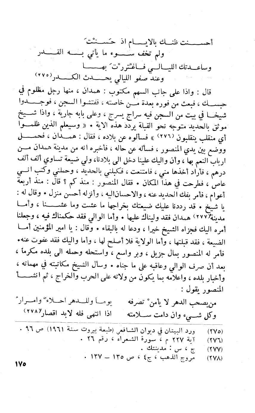 قَالَ وَإِذا على جَانب السهْم مَكْتُوب هَمدَان مِنْهَا رجل مظلوم فِي حَبسك فَبعث من فوره من خاصته ففتشوا السجْن فوجدوا شَيخنَا فِي بَيت من السجْن فِيهِ سراج يسرج وعَلى بَابه جَارِيَة وَإِذا شيخ موثق بالحديد مُتَوَجّه نَحْو الْقبْلَة يردد هَذِه الاية {وَسَيعْلَمُ الَّذين ظلمُوا أَي مُنْقَلب يَنْقَلِبُون} فَسَأَلُوهُ عَن بِلَاده فَقَالَ هَمدَان فَحمل وَوضع بَين يَدي الْمَنْصُور فَسَأَلَهُ عَن حَاله فاخبره انه نم مَدِينَة هَمدَان من ارباب النعم بهَا وان واليك علينا دخل بِلَادنَا ولي ضيعته تَسَاوِي ألف ألف دِرْهَم أَرَادَ اخذها مني فامتنعت فكبلني بالحديد وحملني وَكتب أَنِّي عَاص فطرحت فِي هَذَا الْمَكَان فَقَالَ الْمَنْصُور مُنْذُ كم قَالَ مُنْذُ اربعة اعوام أَمر بفك الْحَدِيد عَنهُ والاحسان اليه وانزله احسن منزل وَقَالَ لَهُ يَا شيخ قد رددنا عَلَيْك ضيعتك بخراجها مَا عِشْت وَمَا عِشْنَا واما مَدِينَة هَمدَان فقد وليناك عَلَيْهَا واما الْوَالِي فقد حكمناك فِيهِ وَجَعَلنَا امْرَهْ اليك فجزاه الشَّيْخ خيرا ودعا لَهُ بِالْبَقَاءِ وَقَالَ يَا امير الْمُؤمنِينَ إِمَّا الضَّيْعَة فقد قبلتها واما الْولَايَة فَلَا اصلح لَهَا واما واليك فقد عَفَوْت عَنهُ أَمر لَهُ الْمَنْصُور بِمَال جزيل وَبرا وَاسع واستحله وَحمله إِلَى بَلَده مكرما بعد أَن صرف الْوَالِي وعاقبه على مَا جناه وسال الشَّيْخ مُكَاتبَته فِي مهماته واخبار بَلَده واعلامه بِمَا يكون من ولَايَته على الْحَرْب وَالْخَرَاج ثمَّ انشأ الْمَنْصُور يَقُول