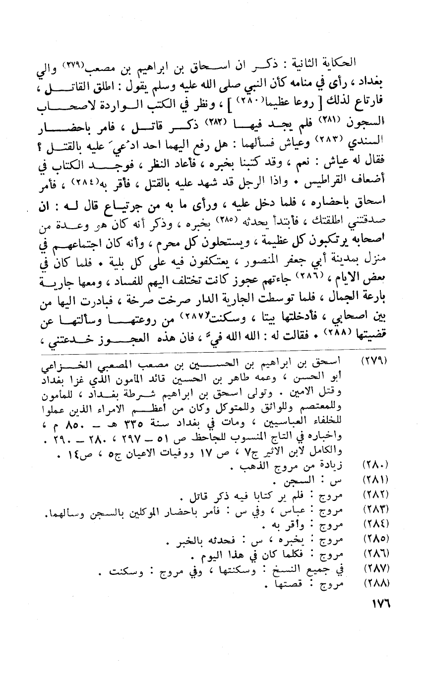 الْحِكَايَة الثَّانِيَة ذكر أَن اسحقاق بن إِبْرَاهِيم بن مُصعب وَالِي بَغْدَاد رَأْي فِي مَنَامه كَأَن النَّبِي ص صلى الله عَلَيْهِ وَسلم يَقُول اطلق الْقَاتِل فارتاع لذَلِك روعا عَظِيما وَنظر فِي الْكتب الْوَارِدَة لاصحاب السجون فَلم يجد فِيهَا ذكر قَاتل فَأمر باحضار السندي وَعَيَّاش فَسَأَلَهُمَا هَل رفع اليهما أحد ادعِي عَلَيْهِ بِالْقَتْلِ فَقل لَهُ عَيَّاش نعم وَقد كتبنَا بِخَبَرِهِ فاعاد النّظر فَوجدَ الْكتاب فِي اضعاف الْقَرَاطِيس وَإِذا الرجل قد شهد عَلَيْهِ بِالْقَتْلِ فاقر بِهِ فَأمر اسحاق باحضاره فَلَمَّا دخل عَلَيْهِ وَرَأى مَا بِهِ من جرتياع قَالَ لَهُ أَن صدقتني اطلقتك فابتدأ يحدثه بِخَبَرِهِ وَذكر انه كَانَ هُوَ وعدة من أَصْحَابه يرتكبون كل عَظِيمَة ويستحلون كل محرم وَأَنه كَانَ اجْتِمَاعهم فِي منزل بِمَدِينَة أبي جَعْفَر الْمَنْصُور يعتكفون فِيهِ على كل بلية فَلَمَّا كَانَ فِي بعض الايام جَاءَتْهُم عَجُوز كَانَت تخْتَلف اليهم للْفَسَاد وَمَعَهَا جَارِيَة بارعة الْجمال فَلَمَّا توسطت الْجَارِيَة الدَّار صرخت صرخة فبادرت اليها من بَين اصحابي فأدخلتها بَيْتا وسكنت من روعتها وسألتها عَن قضيتها فَقَالَت لَهُ الله الله فِي فان هَذِه الْعَجُوز خدعتني