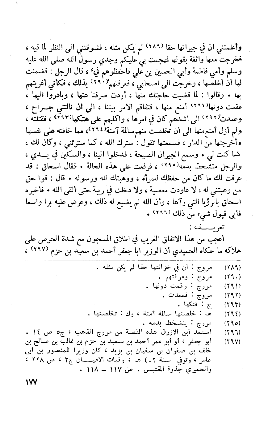 واعلمتني أَن فِي جِيرَانهَا حَقًا لم يكن مثله فشوقتني إِلَى النّظر لما فِيهِ فَخرجت مَعهَا واثقة بقولِهَا فهجمت بِي عَلَيْكُم وجدي رَسُول الله ص صلى الله عَلَيْهِ وَسلم وامي فَاطِمَة وَأبي الْحُسَيْن بن عَليّ فاحفظوهم فِي قَالَ الرجل فضمنت لَهَا أَن اخلصها وَخرجت إِلَى اصحابي فعرفتهم بذلك فَكَأَنِّي اغريتهم بهَا وَقَالُوا لما قضيت حَاجَتك مِنْهَا اردت صرفنَا عَنْهَا وَبَادرُوا اليها فَقُمْت دونهَا امْنَعْ مِنْهَا فتفاقم الْأَمر بَيْننَا إِلَى أَن نالتني جراح وعمدت إِلَى اشدهم كَانَ فِي امرها واكلبهم على هتكها فَقتلته وَلم ازل امْنَعْ مِنْهَا إِلَى أَن تخلصت مِنْهُ سَالِمَة امنة مِمَّا خافته على نَفسهَا واخرجتها من الدَّار فسمعتها نقُول سترك الله كَمَا سترتني وَكَانَ لَك كَمَا كنت لي وَسمع الْجِيرَان الصَّيْحَة فَدَخَلُوا الينا والسكين فِي يَدي وَالرجل متشحط بدمه فَرفعت على هَذِه الْحَالة فَقَالَ اسحاق قد عرفت لَك مَا كَانَ من حفظك للْمَرْأَة ووهبتك لله وَرَسُوله قَالَ فوا حق من وهبتني لَهُ وَلَا عاودت مَعْصِيّة وَلَا دخلت فِي رِيبَة حَتَّى القى الله فاخبره اسحاق بالرؤيا الَّتِي راها وان الله لم يضيع لَهُ ذَلِك وَعرض عَلَيْهِ برا وَاسِعًا فابى قبُول شَيْء من ذَلِك