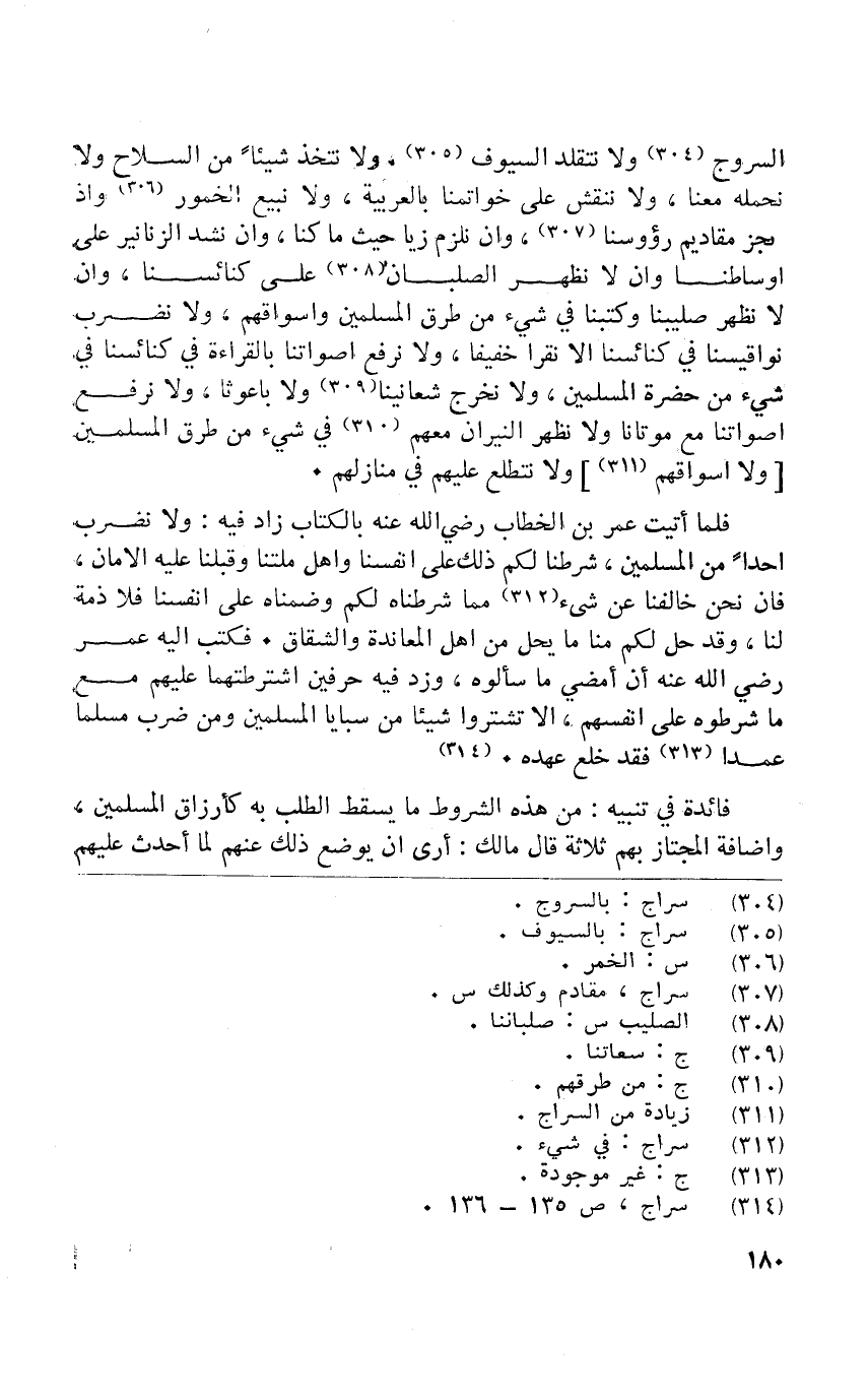 السُّرُوج وَلَا نتقلد السيوف وَلَا تتَّخذ شَيْئا من السِّلَاح وَلَا نحمله مَعنا وَلَا ننقش على خواتمنا بِالْعَرَبِيَّةِ وَلَا نبيع الْخُمُور واذ نجز مقاديم رؤوسنا وان نلزم زيا حَيْثُ مَا كُنَّا وان نَشد الزنانير على اوساطنا وان لَا نظهر الصلبان على كنائسنا وان لَا نظهر صلبينا وكتبنا فِي شَيْء من طرق الْمُسلمين واسواقهم وَلَا نضرب نواقيسنا فِي كنائسنا إِلَّا نقرا خَفِيفا وَلَا نرفع اصواتنا بِالْقِرَاءَةِ فِي كنائسنا فِي شَيْء من حَضْرَة الْمُسلمين وَلَا نخرج شعانينا وَلَا باعوثا وَلَا نرفع اصواتنا مَعَ مَوتَانا وَلَا نظهر النيرَان مَعَهم فِي شَيْء من طرق الْمُسلمين وَلَا اسواقهم وَلَا نتطلع عَلَيْهِم فِي مَنَازِلهمْ